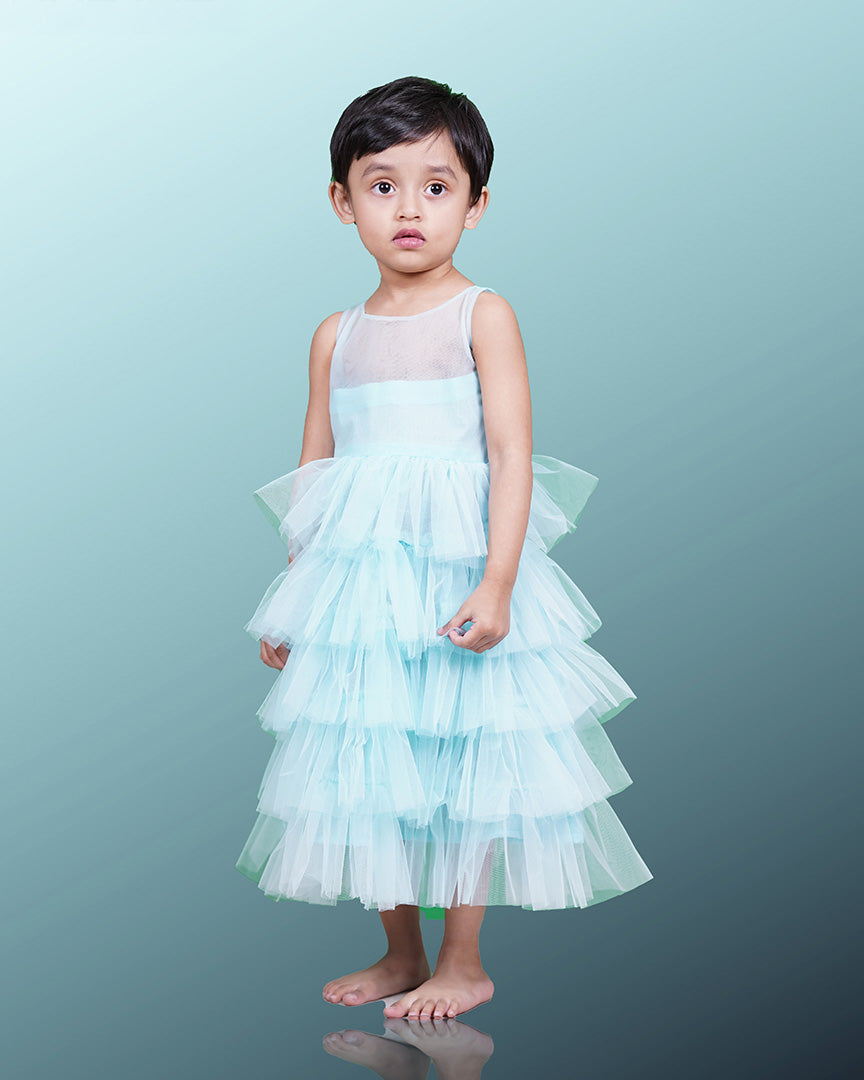 Bright and adorable, this aqua blue frock in soft net layers is made to shine at birthday parties. With its lightweight bounce and dreamy color, it’s the perfect pick for joyful celebrations and memorable photos.