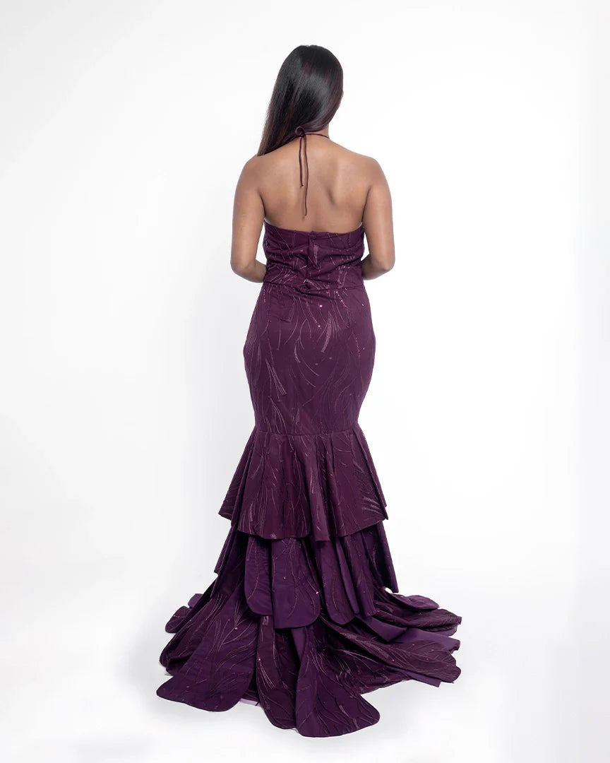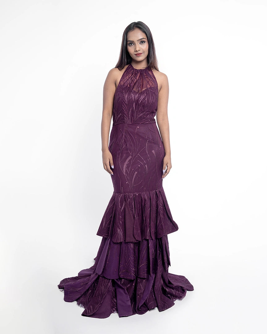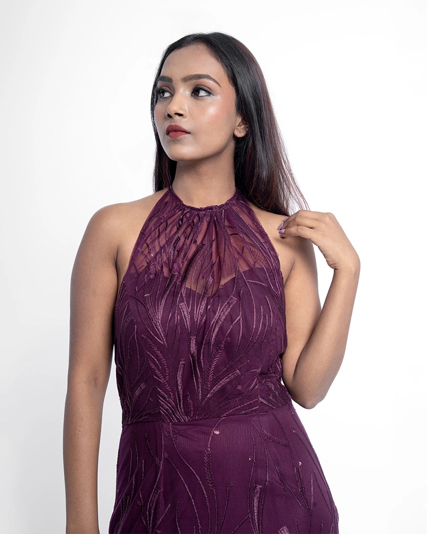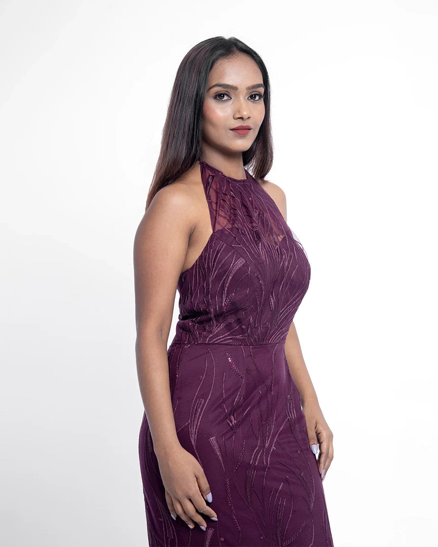 Dramatic style defines this sequinned mermaid gown in a bold purple hue, complete with a halter neckline that commands the spotlight at every step.