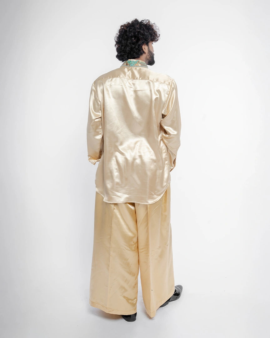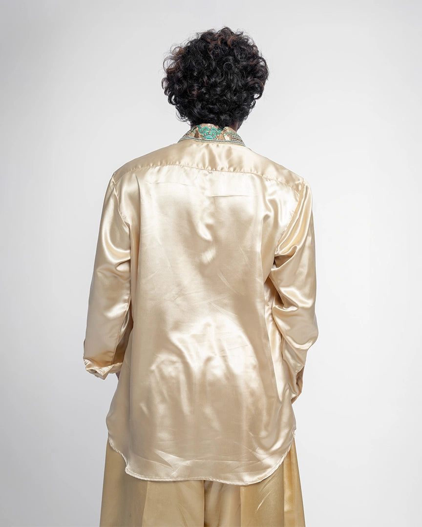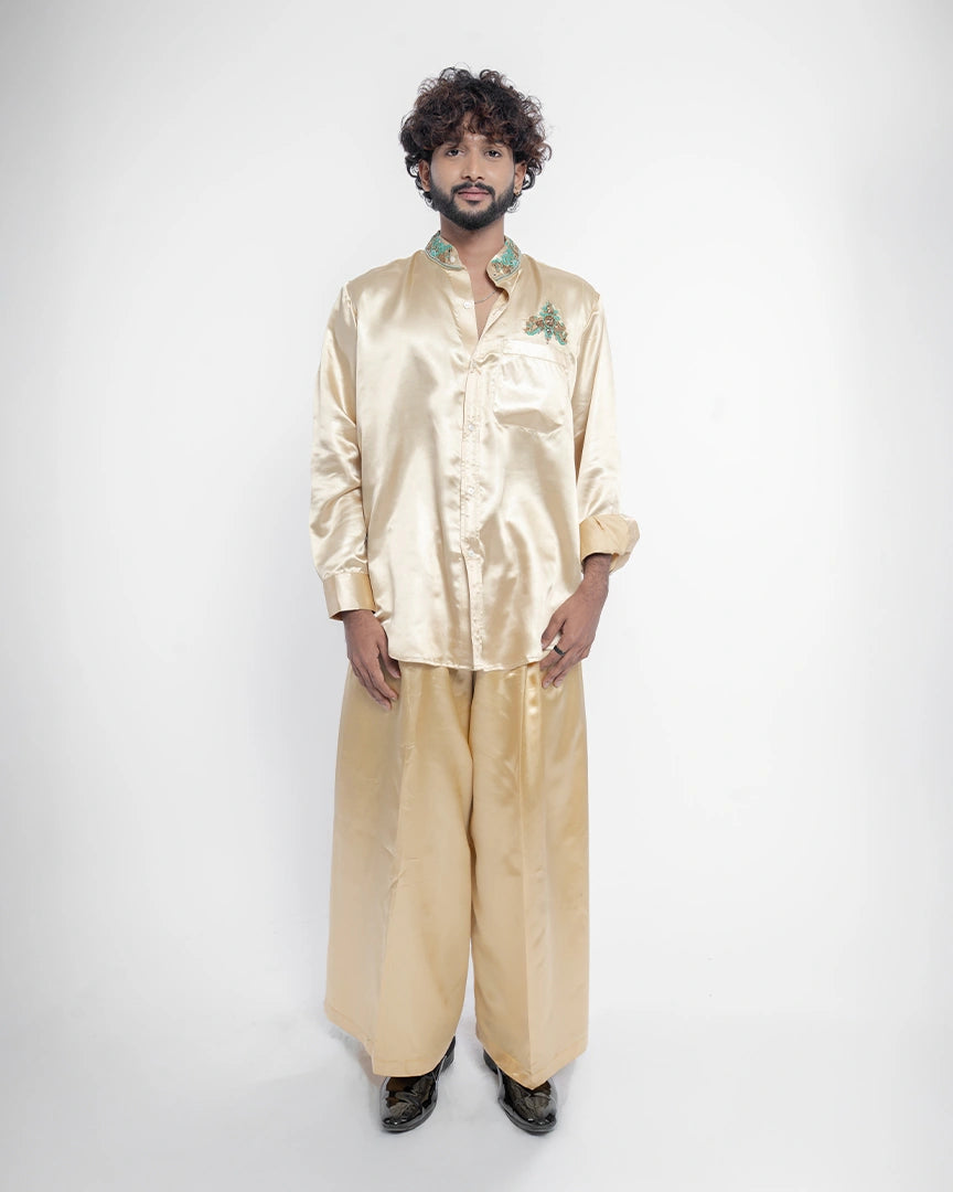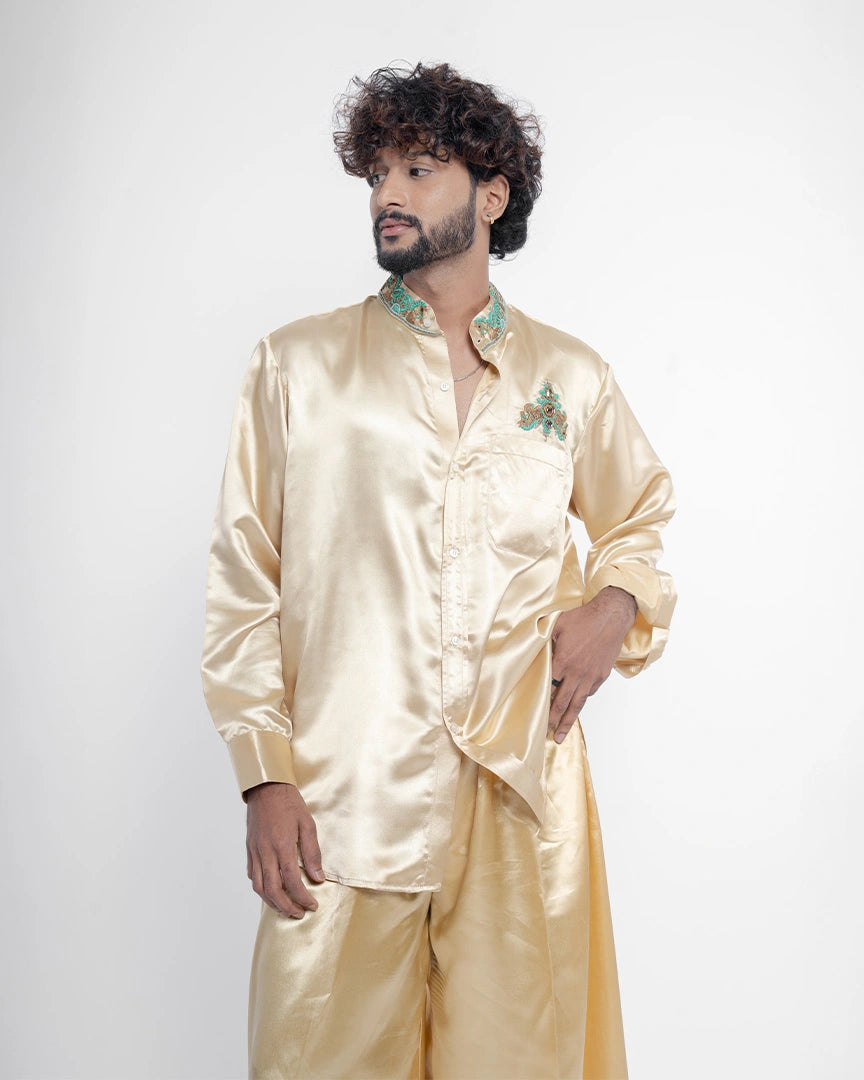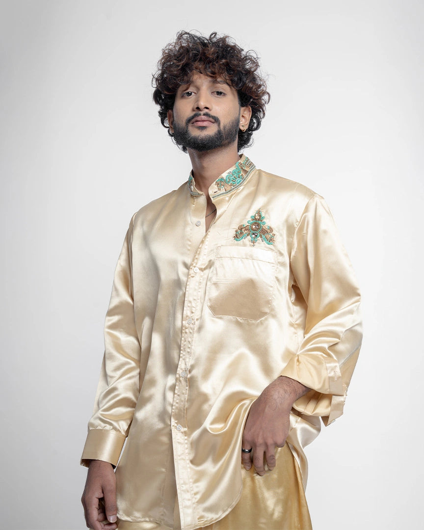 Regal elegance shines through this golden satin shirt adorned with intricate aari work, beautifully paired with a majestic dhoti pant for a royal ethnic look.