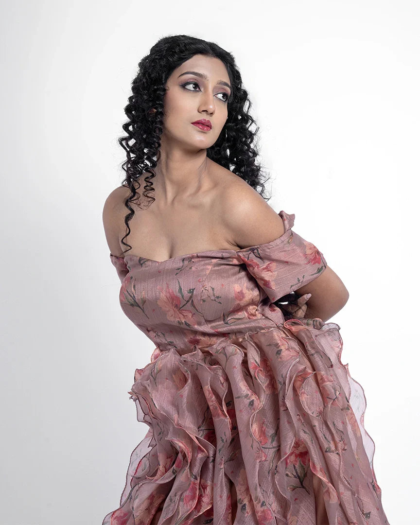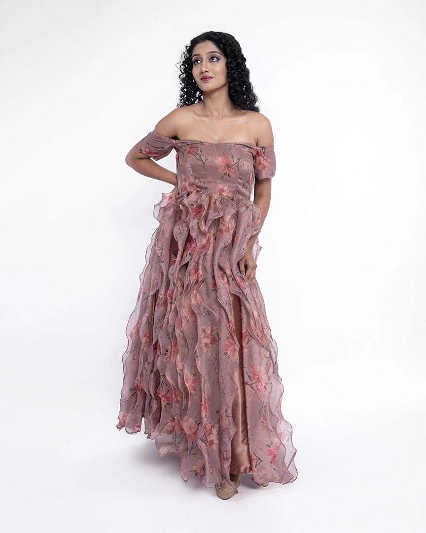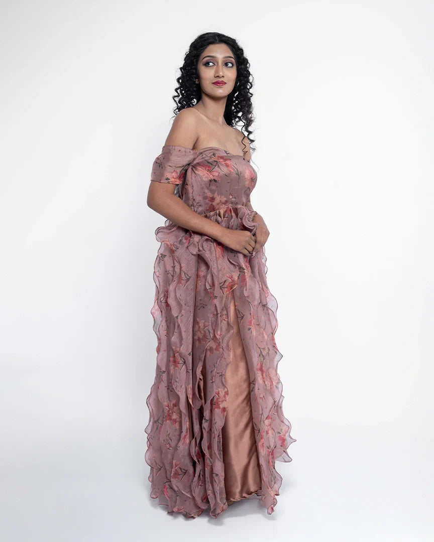Unforgettable is the only word for this off-shoulder gown crafted from delicate tissue fabric, designed with dramatic ruffles that steal the spotlight.