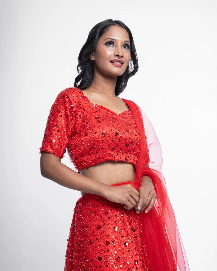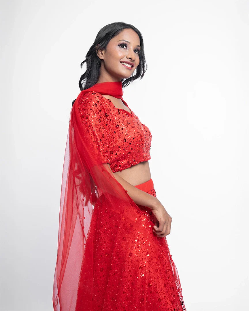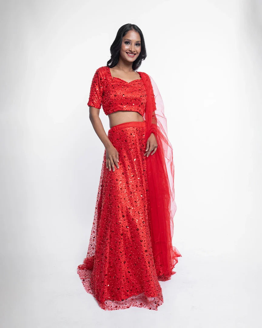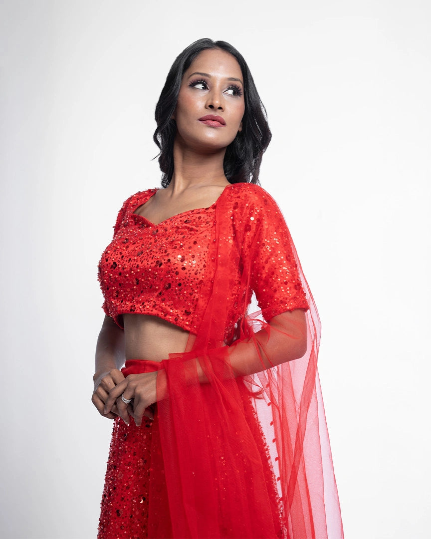 Red hot and sparkling, this lehenga set turns every head with its vibrant hue and sweetheart neckline — a fiery fusion of elegance and celebration.