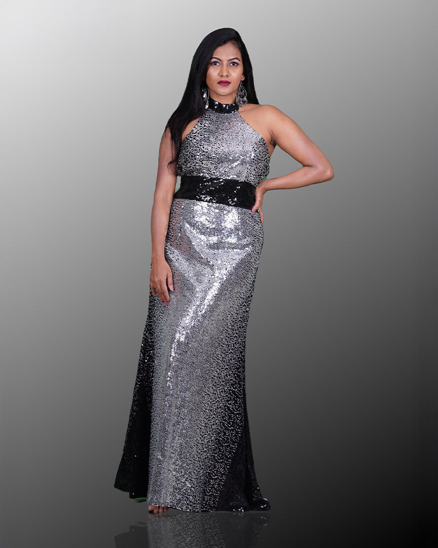 Shimmer through the night in this stunning black and silver sequin western gown featuring a stylish halter neck design. Perfect for evening parties, receptions, or any glam night celebration under the lights.