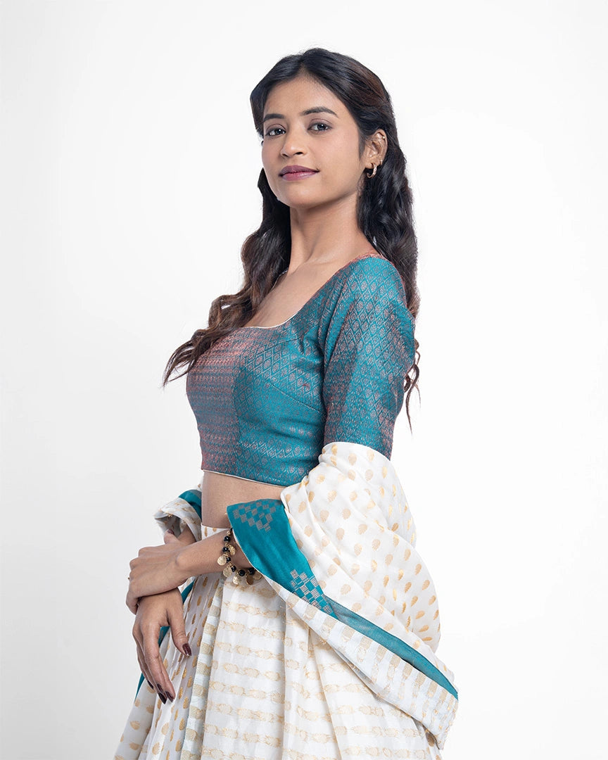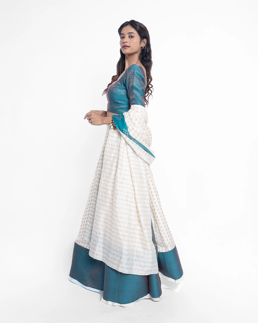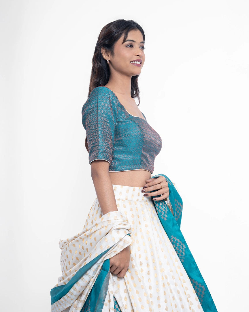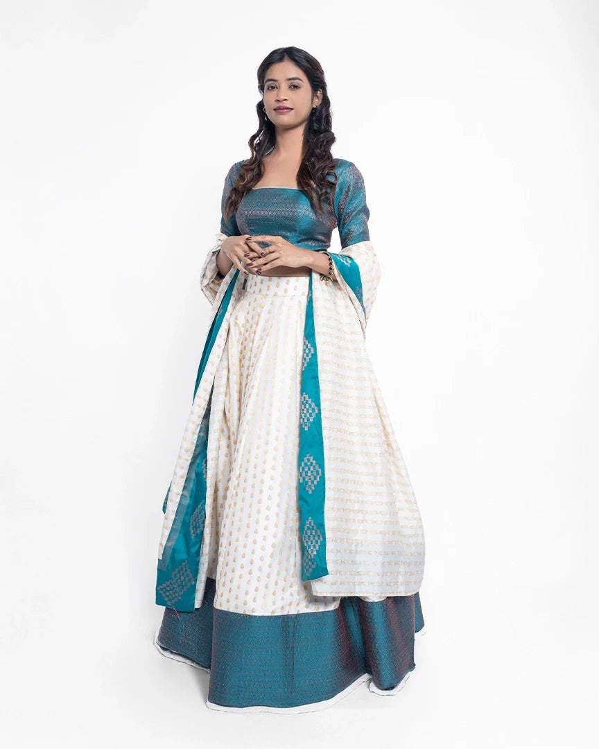An exquisite white and teal blue lehenga that offers a perfect blend of elegance and charm — timeless hues for the modern muse.
