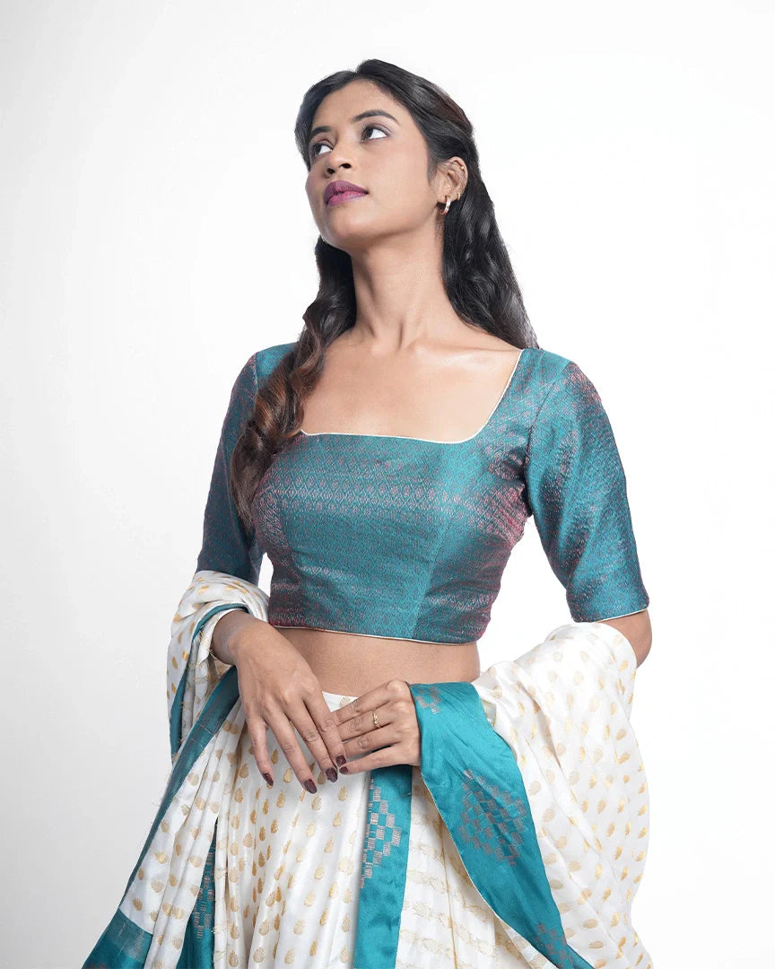 Design: Soft white base with teal blue blouse or dupatta and subtle embellishments