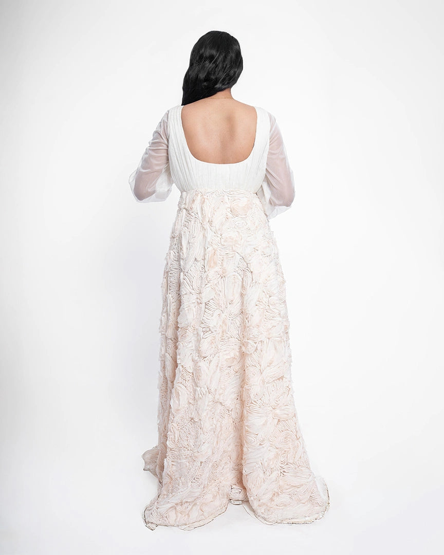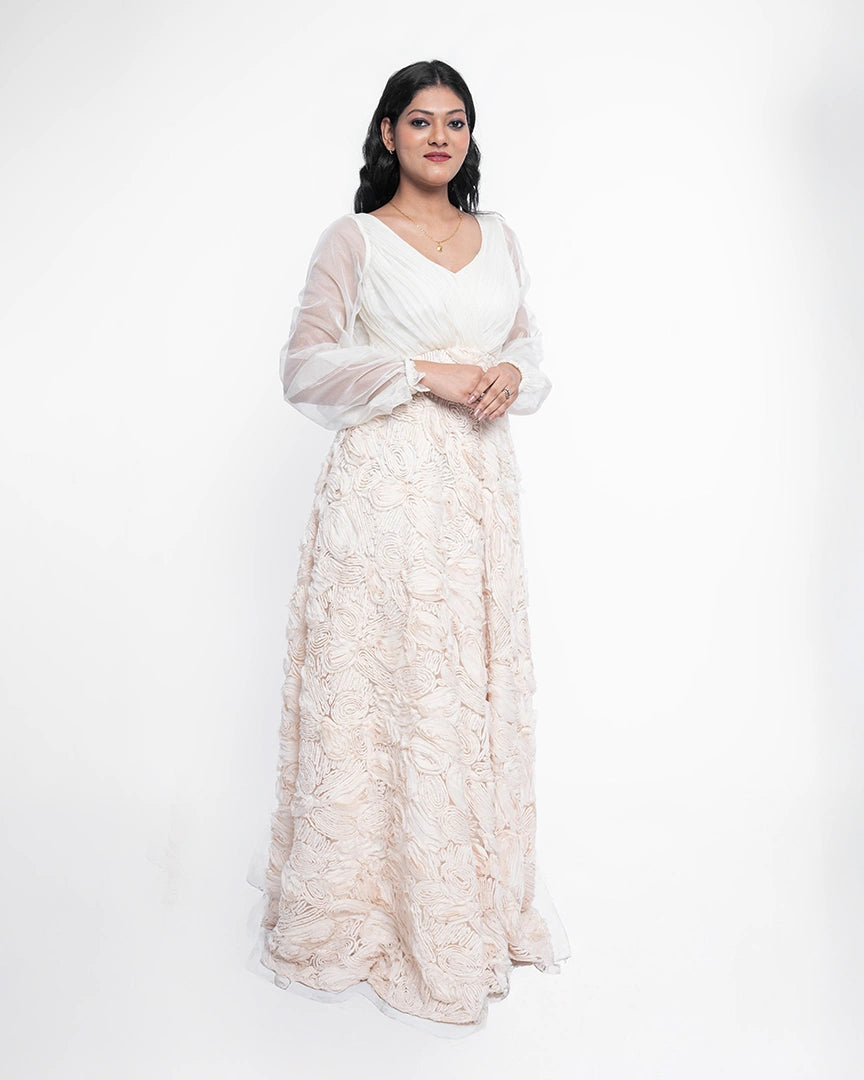 Grace meets simplicity in this exquisite white long frock, made from textured fabric — a timeless piece perfect for elegant occasions and refined celebrations.