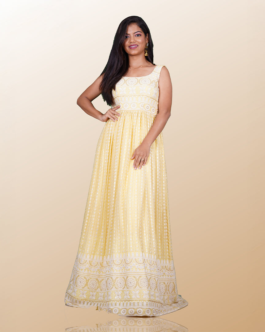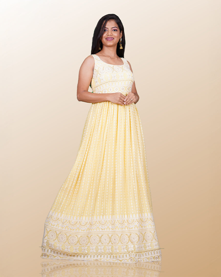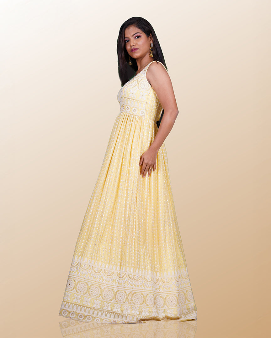 Subtle and graceful, this long gown with a lemon shade features classic chikankari embroidery for a refreshing and elegant look. Ideal for daytime events, festive get-togethers, or a soft ethnic appearance with a modern touch.