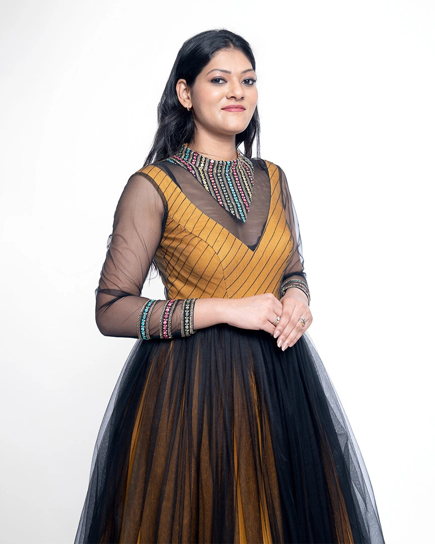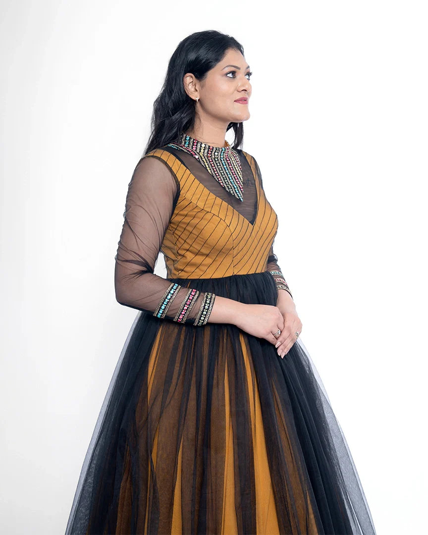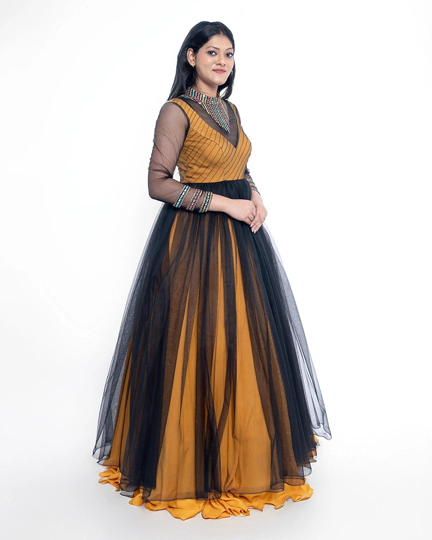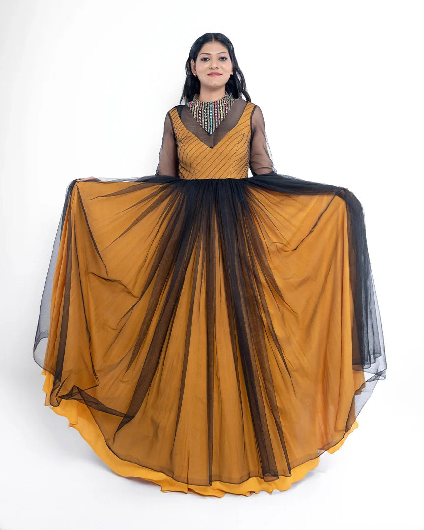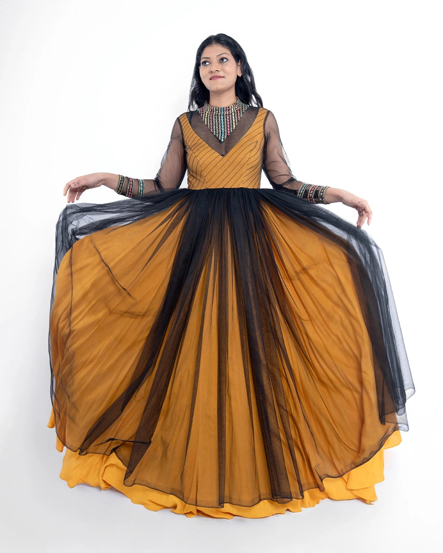 A striking blend of mustard magic and black elegance — this party wear ensemble brings bold contrast and chic style to your night-out wardrobe.