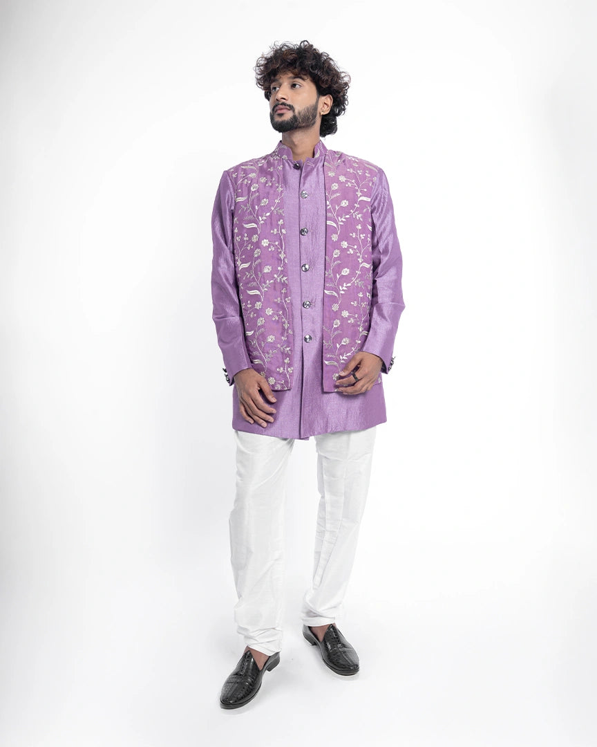 Pair with cream churidar, polished mojaris, and a pastel pocket square. Keep accessories minimal to let the set shine.