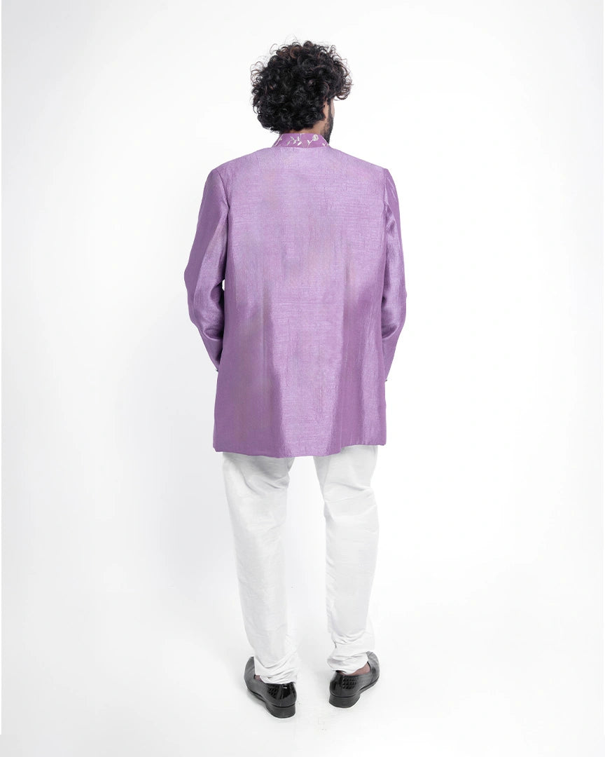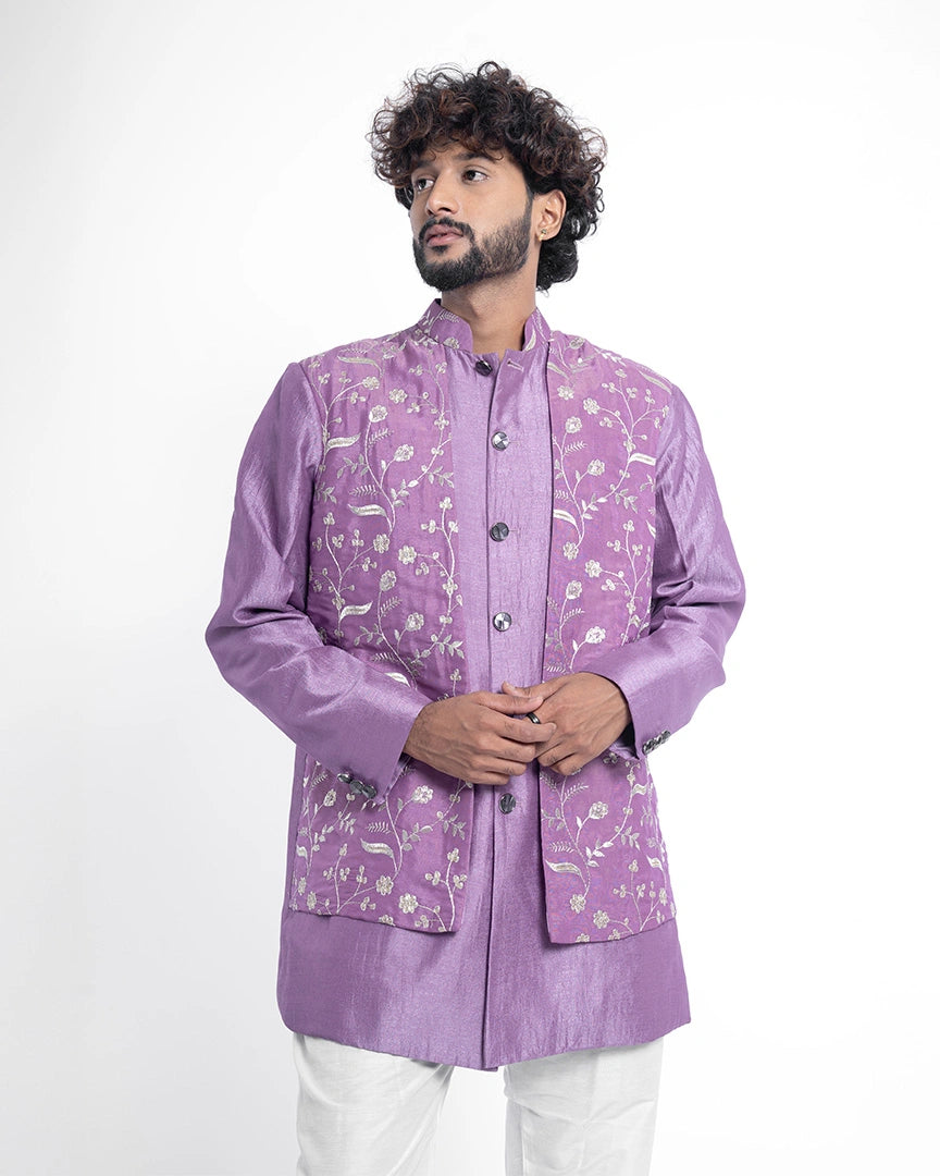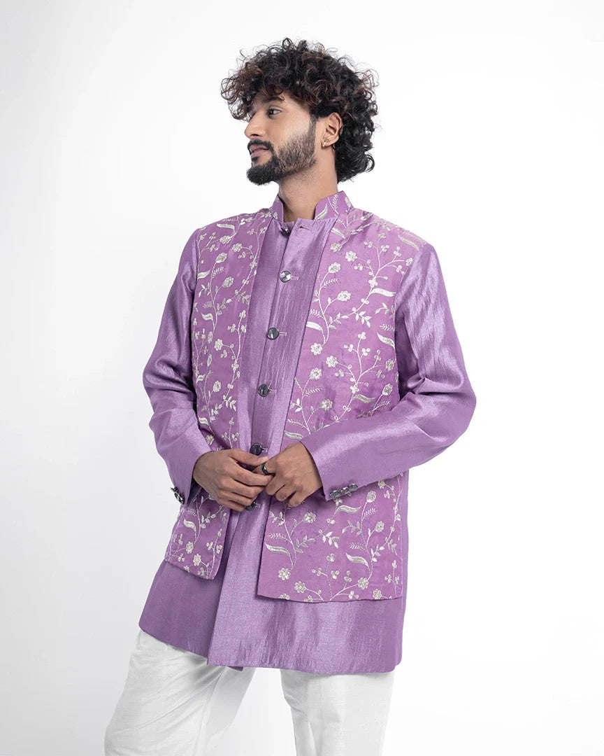 Add a touch of elegance to your wardrobe with this charming light purple kurta, paired with a coordinated vest — a refined look that blends subtle color with effortless style.
