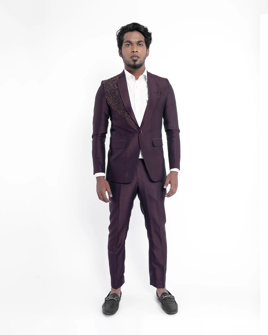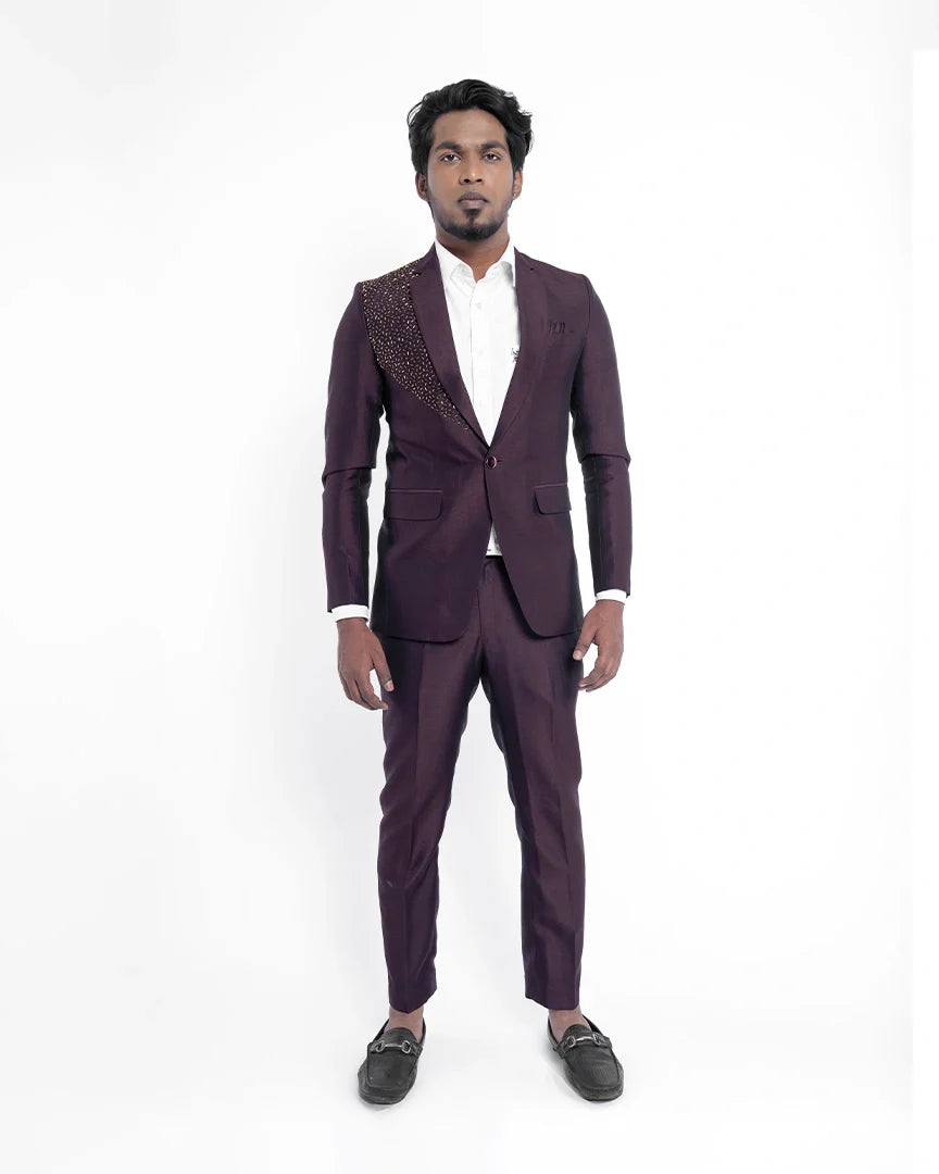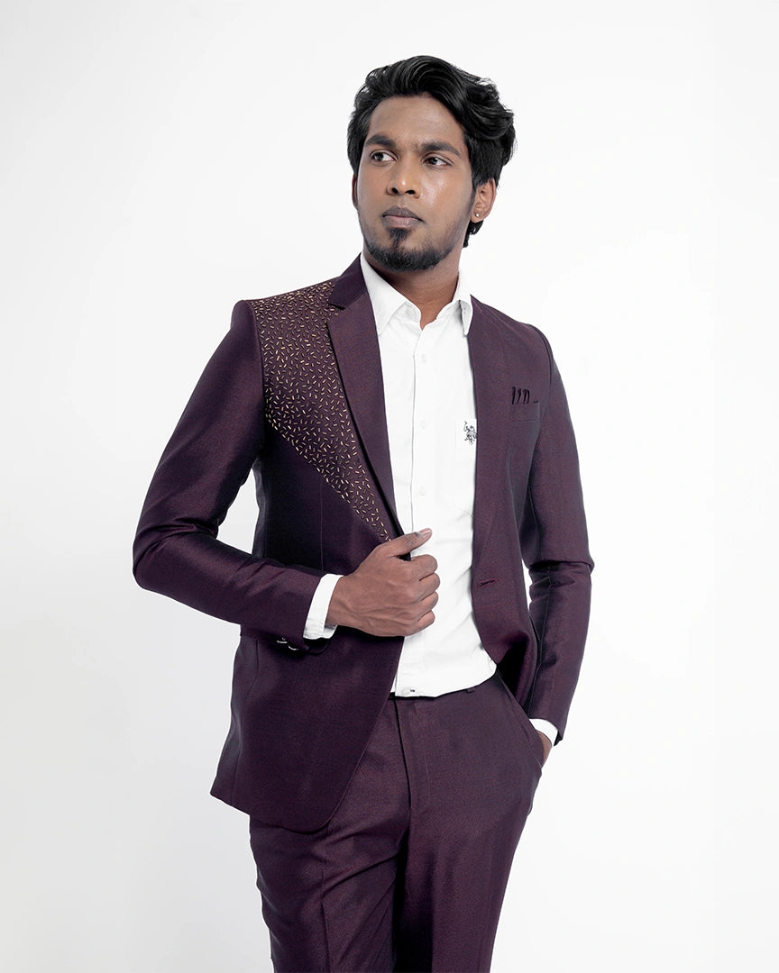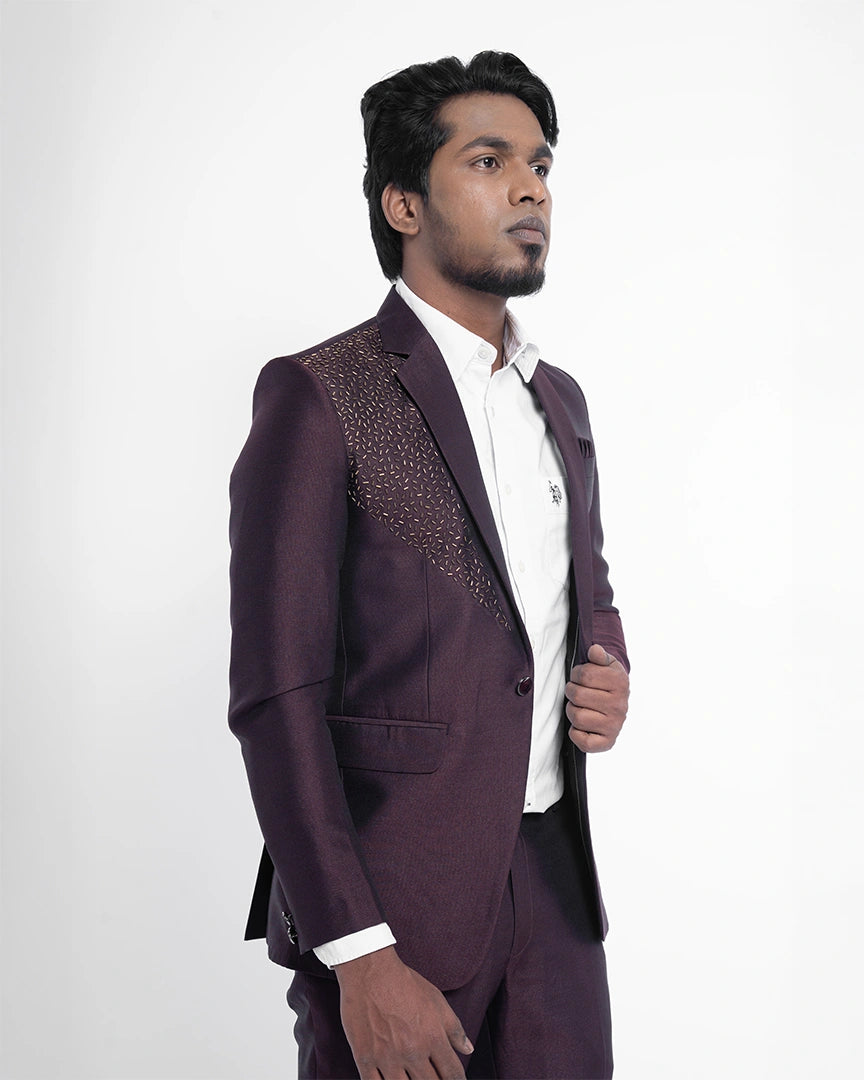 Bold sophistication shines through this rich brown suit, detailed with an embroidered lapel collar for a look that’s sharp, elegant, and attention-grabbing.