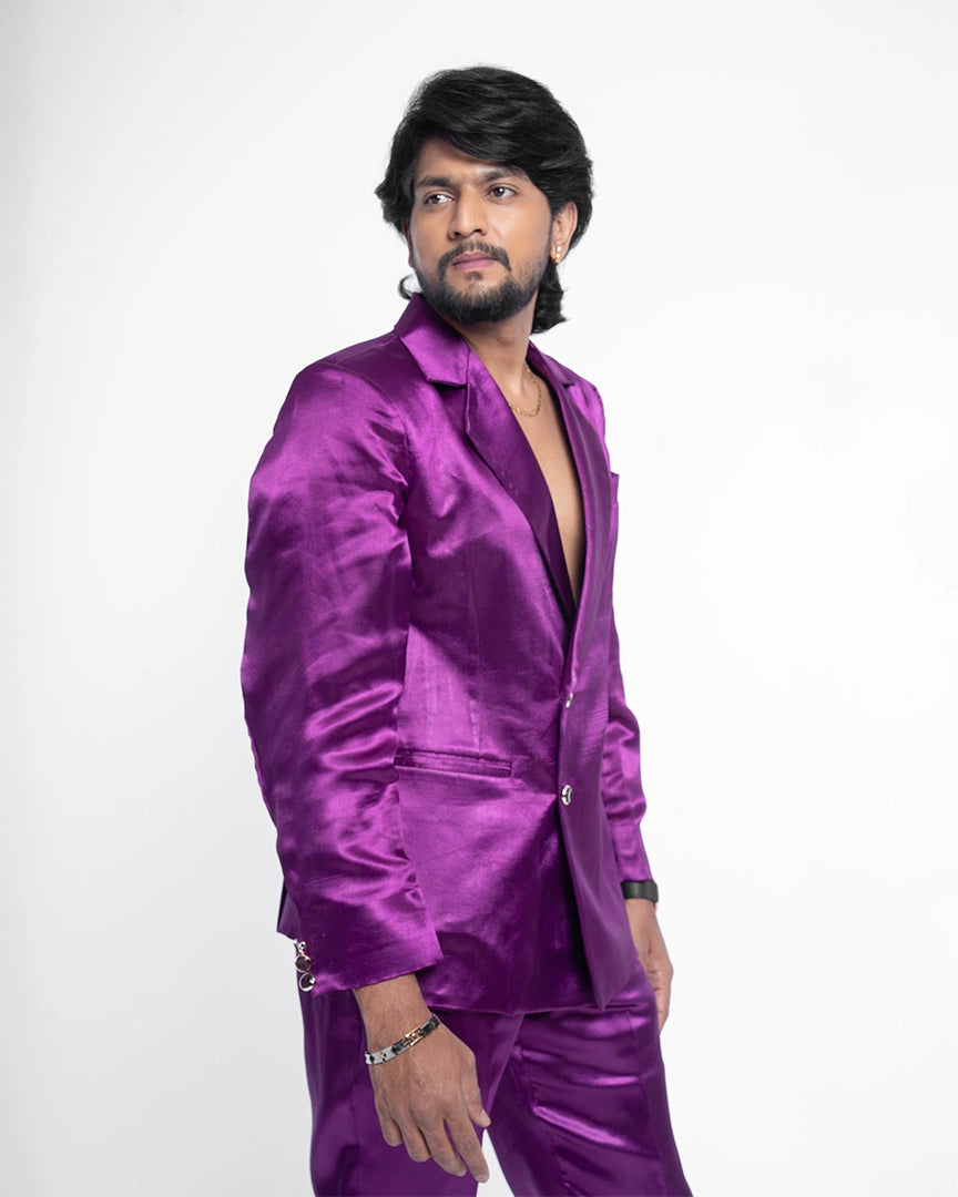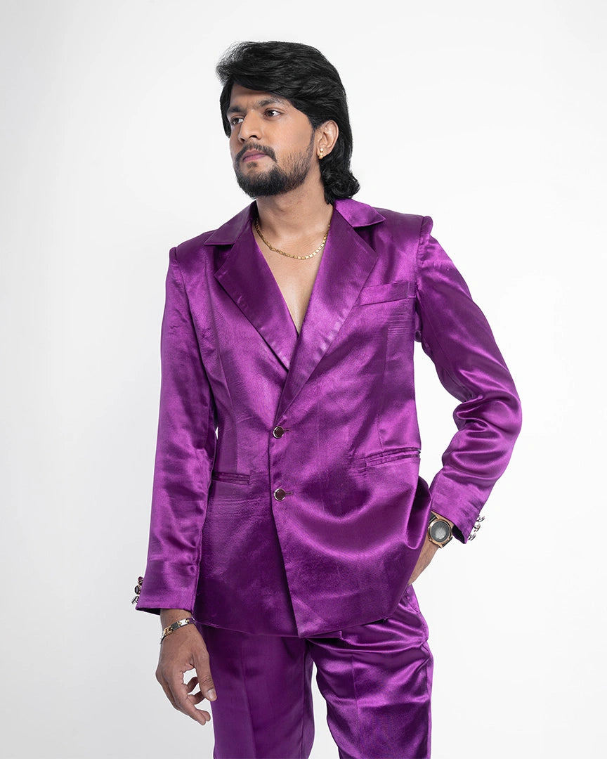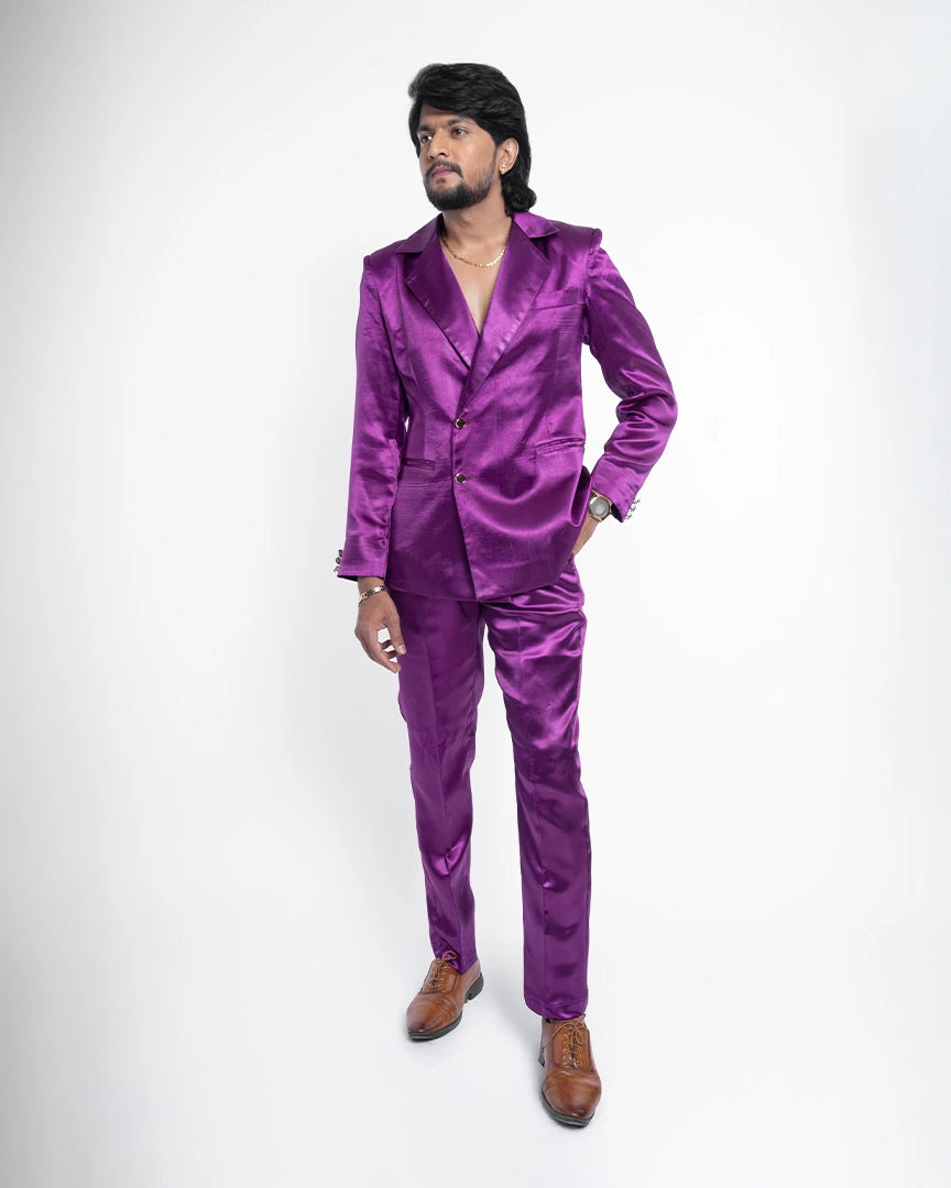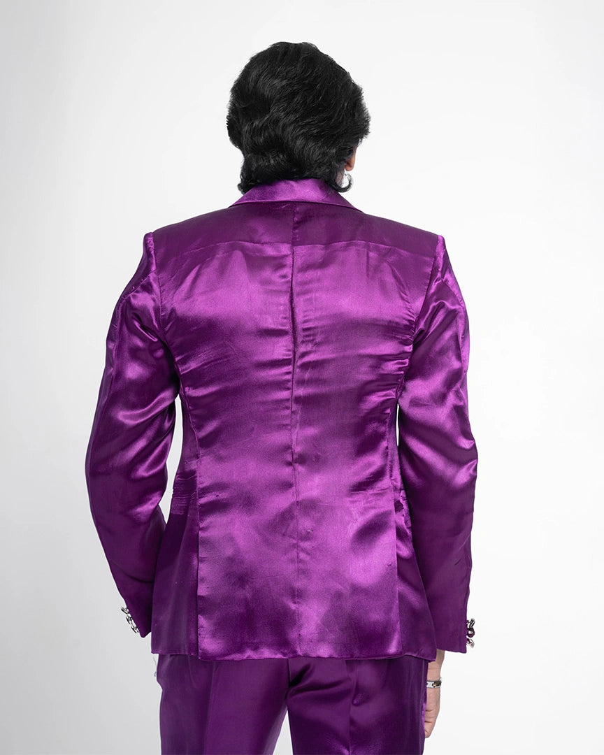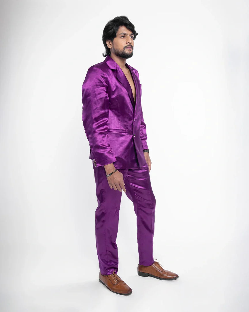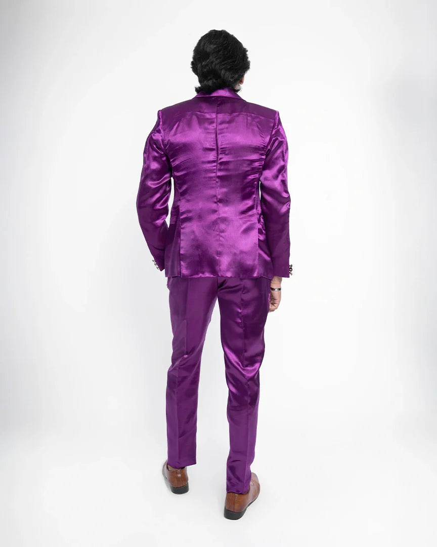 Glamorous style reaches new heights in this shiny purple ensemble — a bold and radiant choice that captures the spotlight with ease.