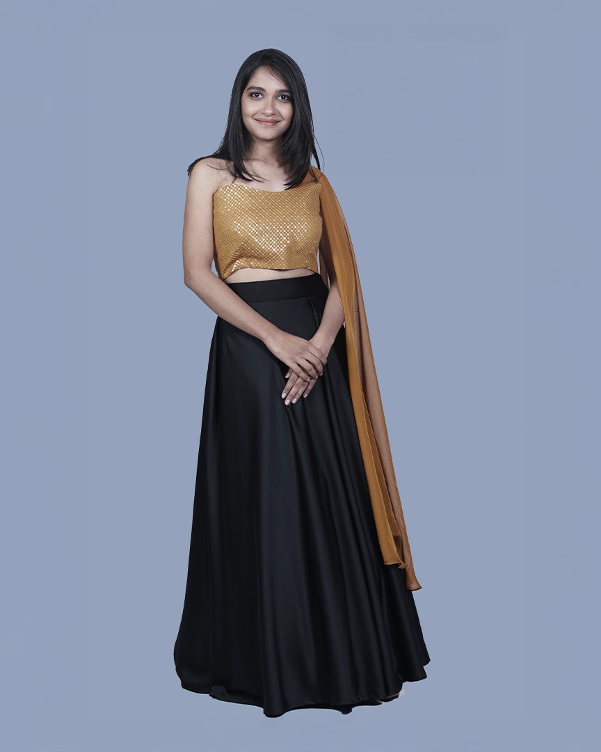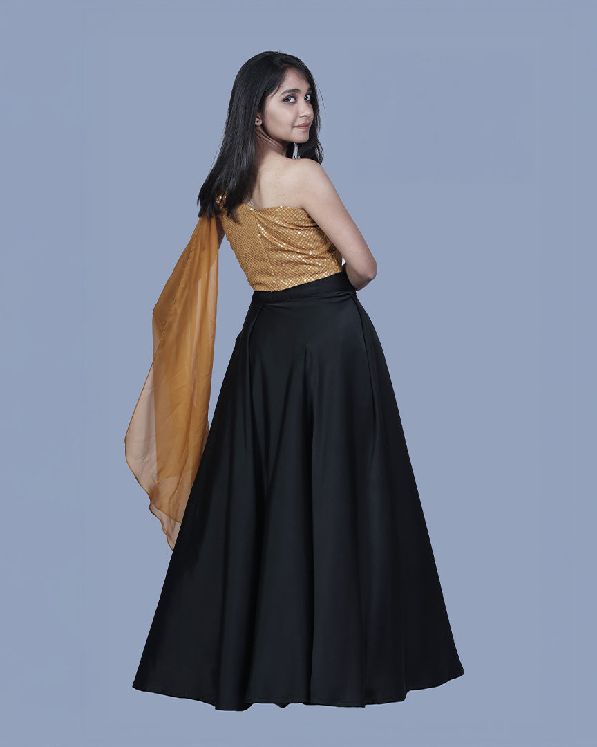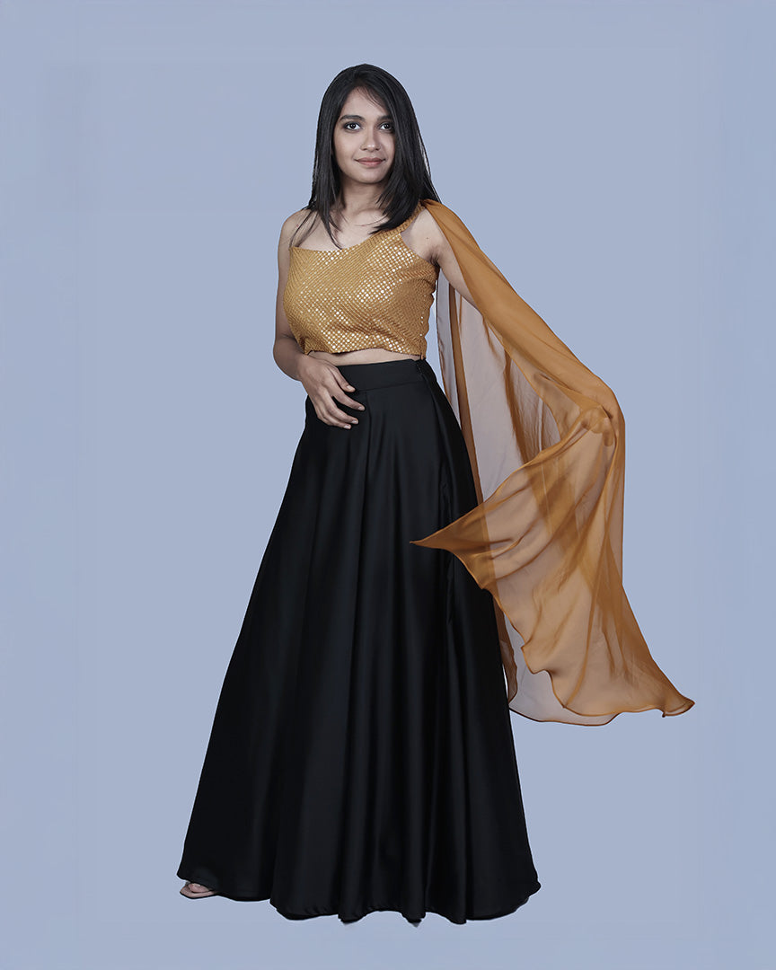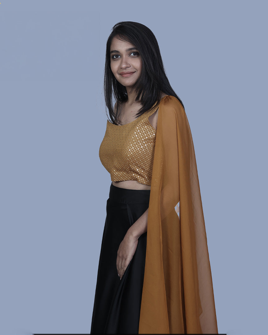 Vibrant yet classy, this mustard layered blouse beautifully contrasts with a bold black lehenga — creating a festive ensemble that’s both traditional and striking. Perfect for weddings, festive nights, or sangeet functions.