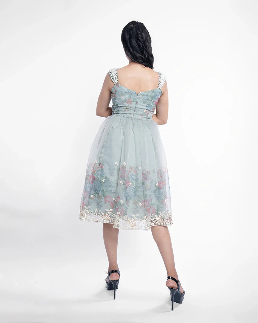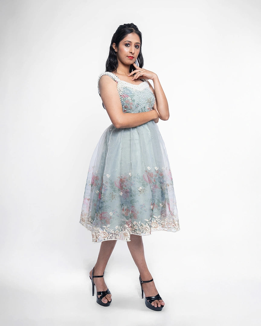 Pair with pearl studs, soft curls, and neutral-toned heels. Keep the makeup fresh and dewy to enhance the ethereal effect.