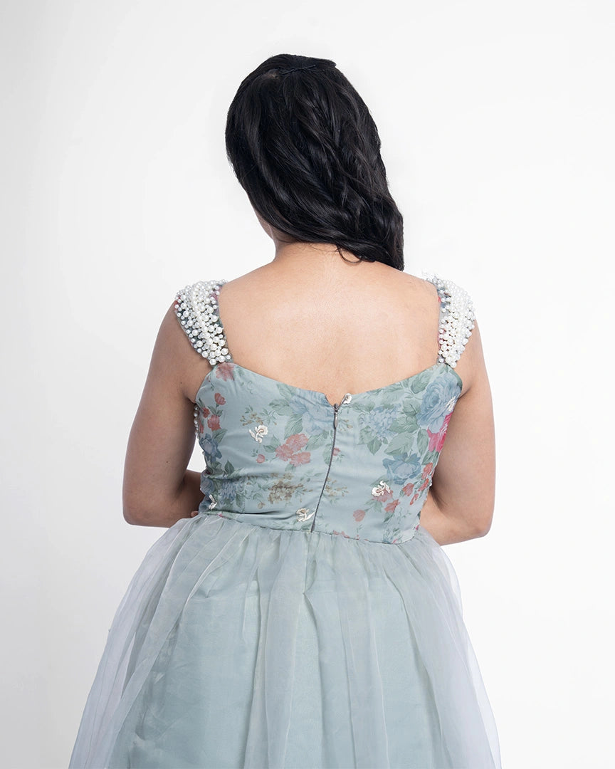 Sheer grace meets neckline sophistication in this pearl-studded organza creation — a look defined by exquisite detailing and timeless charm.