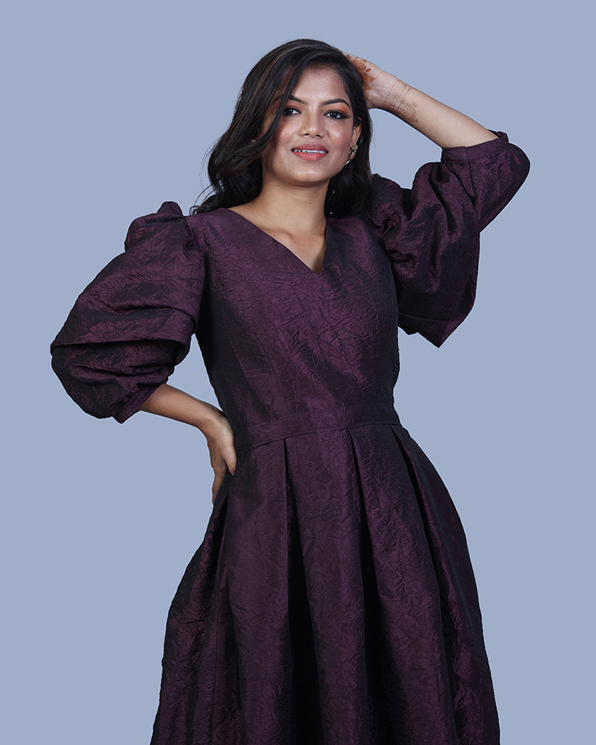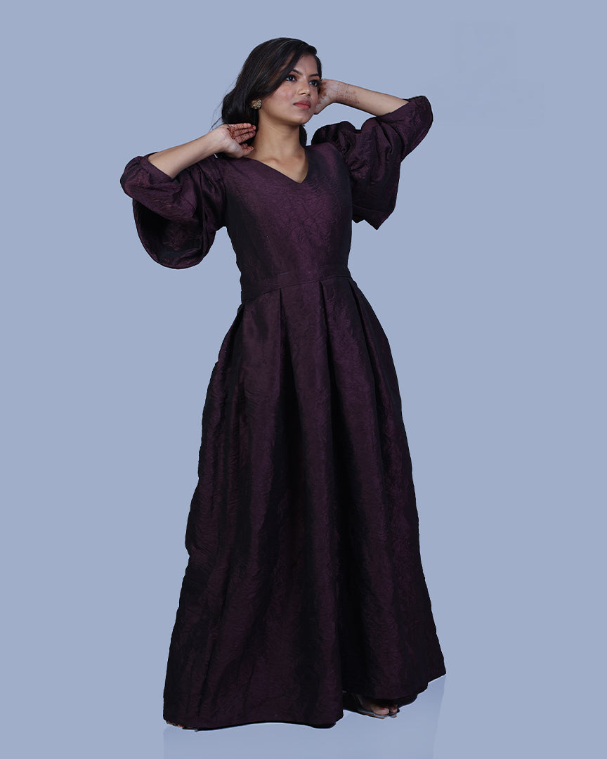 Elegant and effortlessly classy, this coffee brown gown is designed with soft puff sleeves and a flattering pleated body. Perfect for parties and evening get-togethers, it strikes the right balance between charm and sophistication.