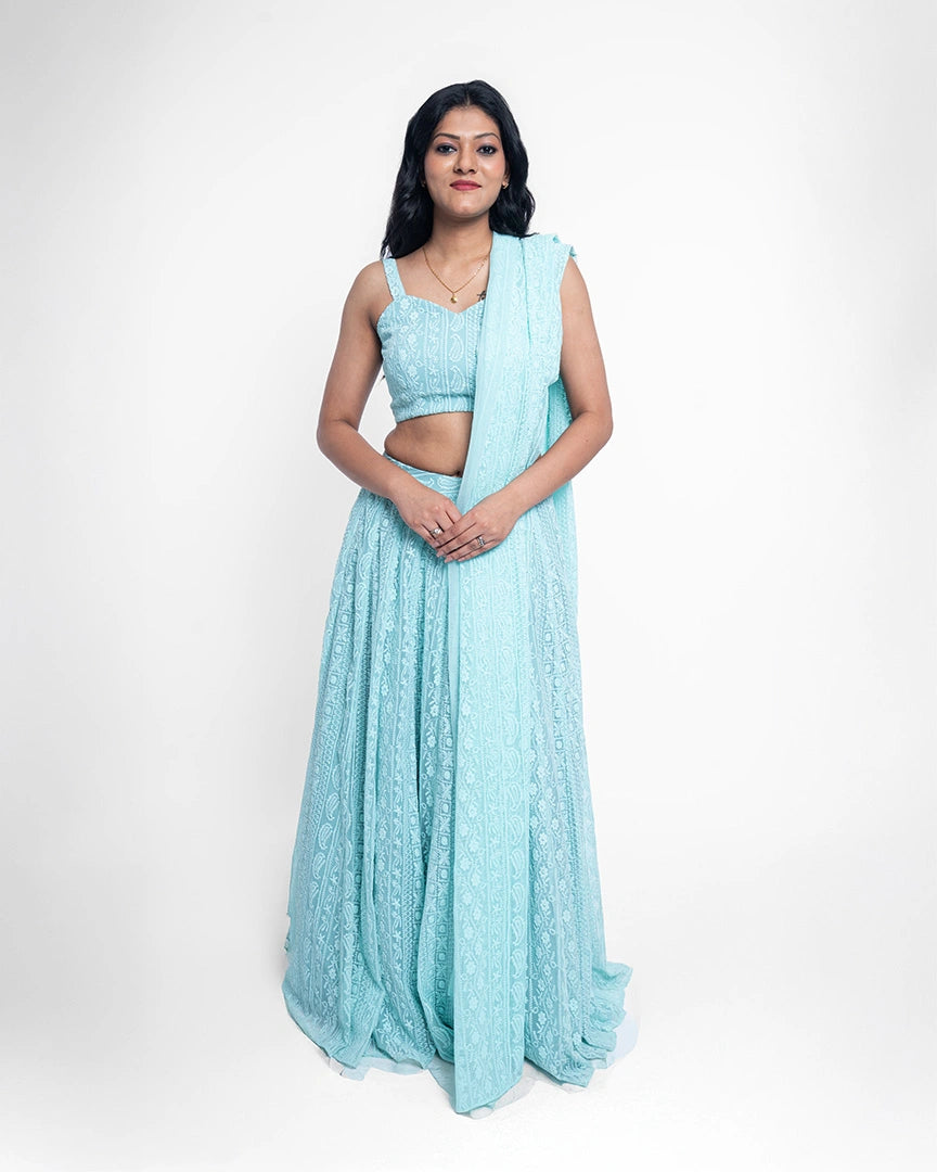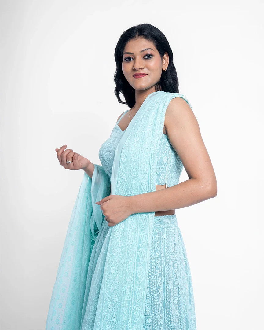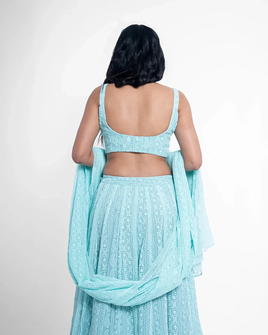 Chikankari beauty meets pastel blue serenity in this lehenga — a vision of graceful elegance perfect for day weddings and dreamy celebrations.