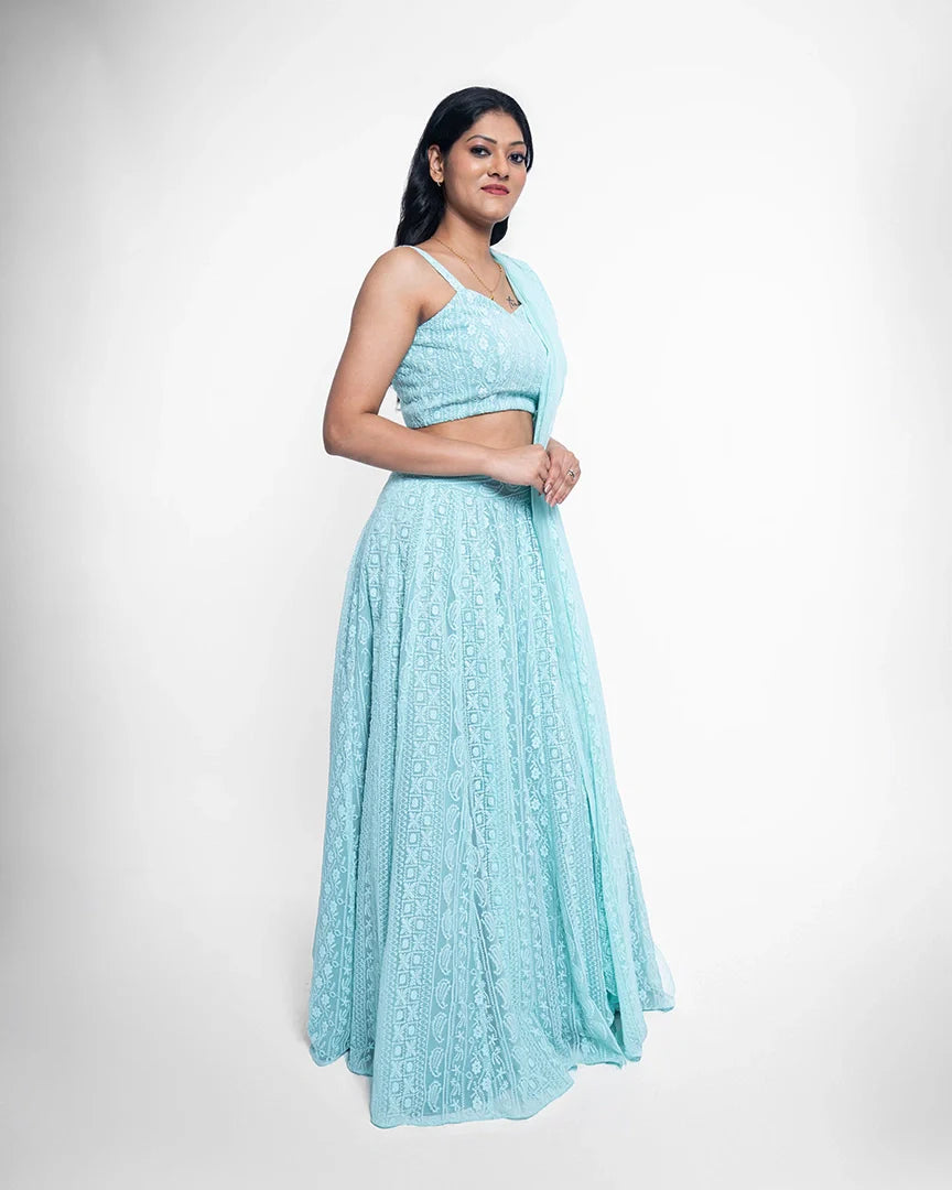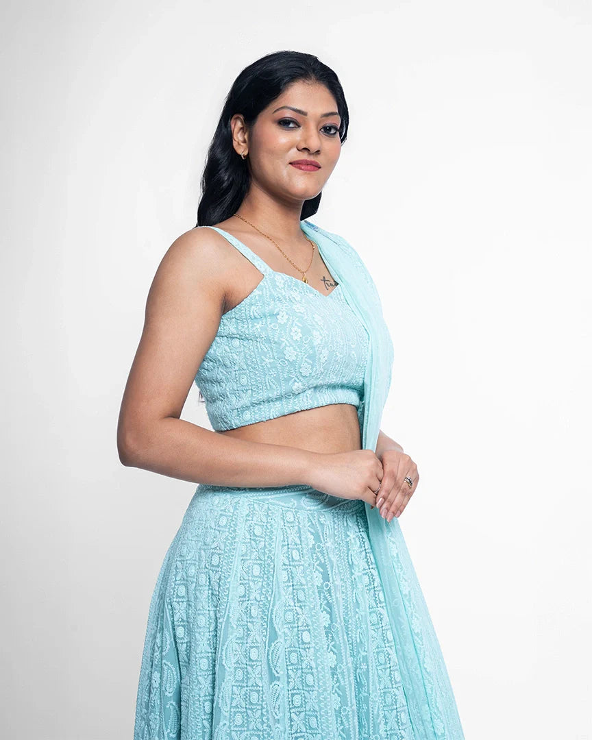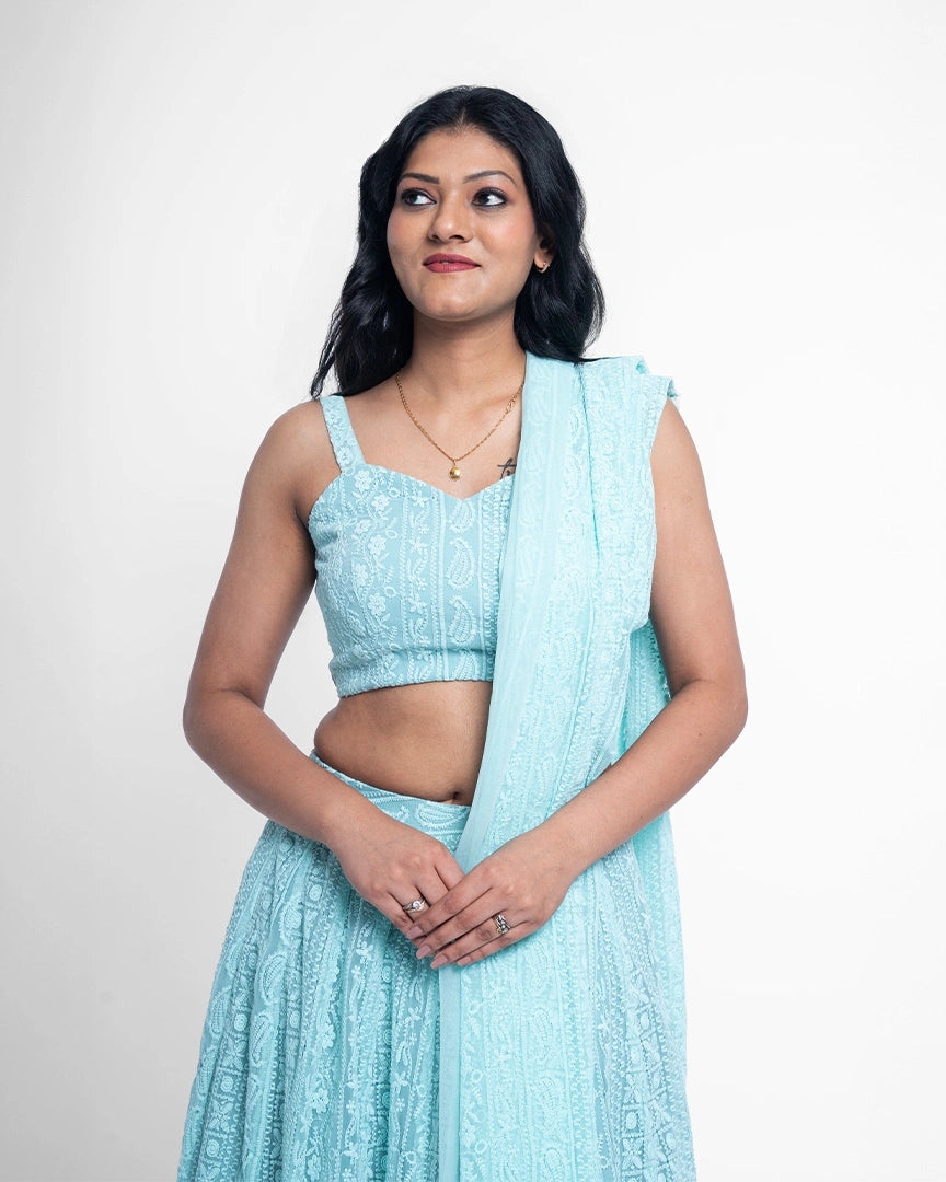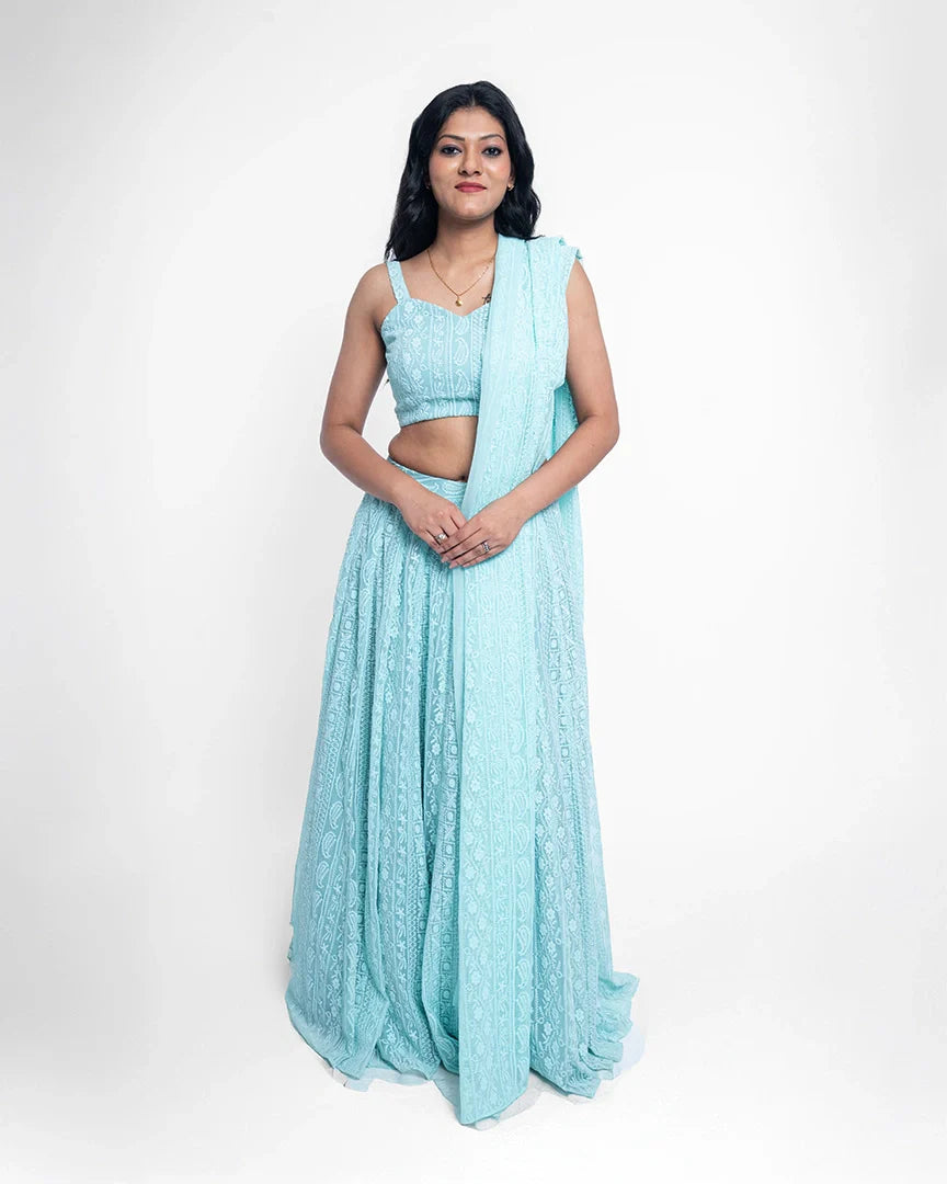 Chikankari beauty meets pastel blue serenity in this lehenga — a vision of graceful elegance perfect for day weddings and dreamy celebrations.