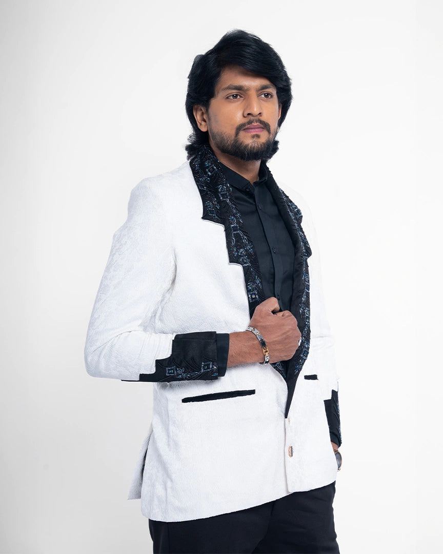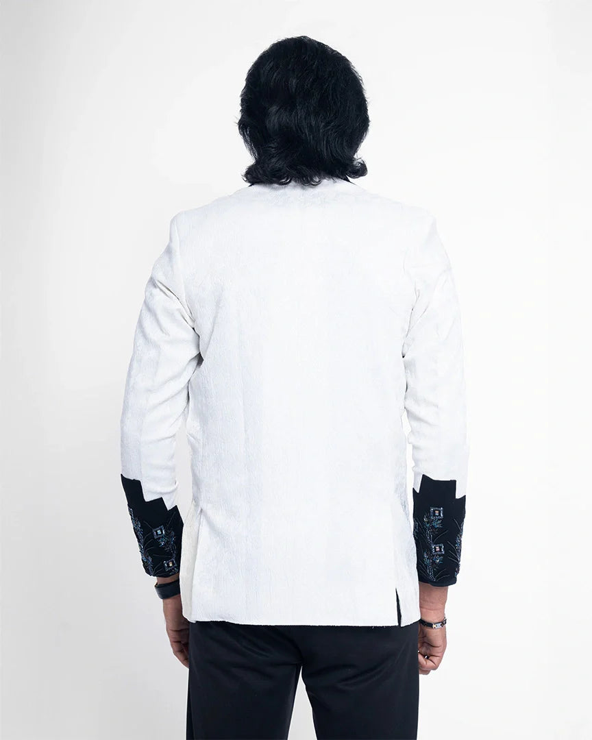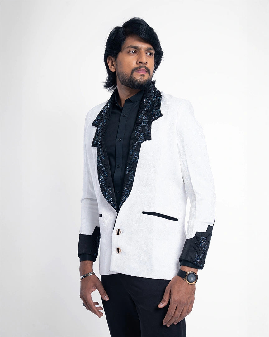 Elegant sophistication defines this white blazer and suit set, beautifully adorned with intricate aari embroidery. A seamless blend of modern tailoring and timeless craftsmanship.