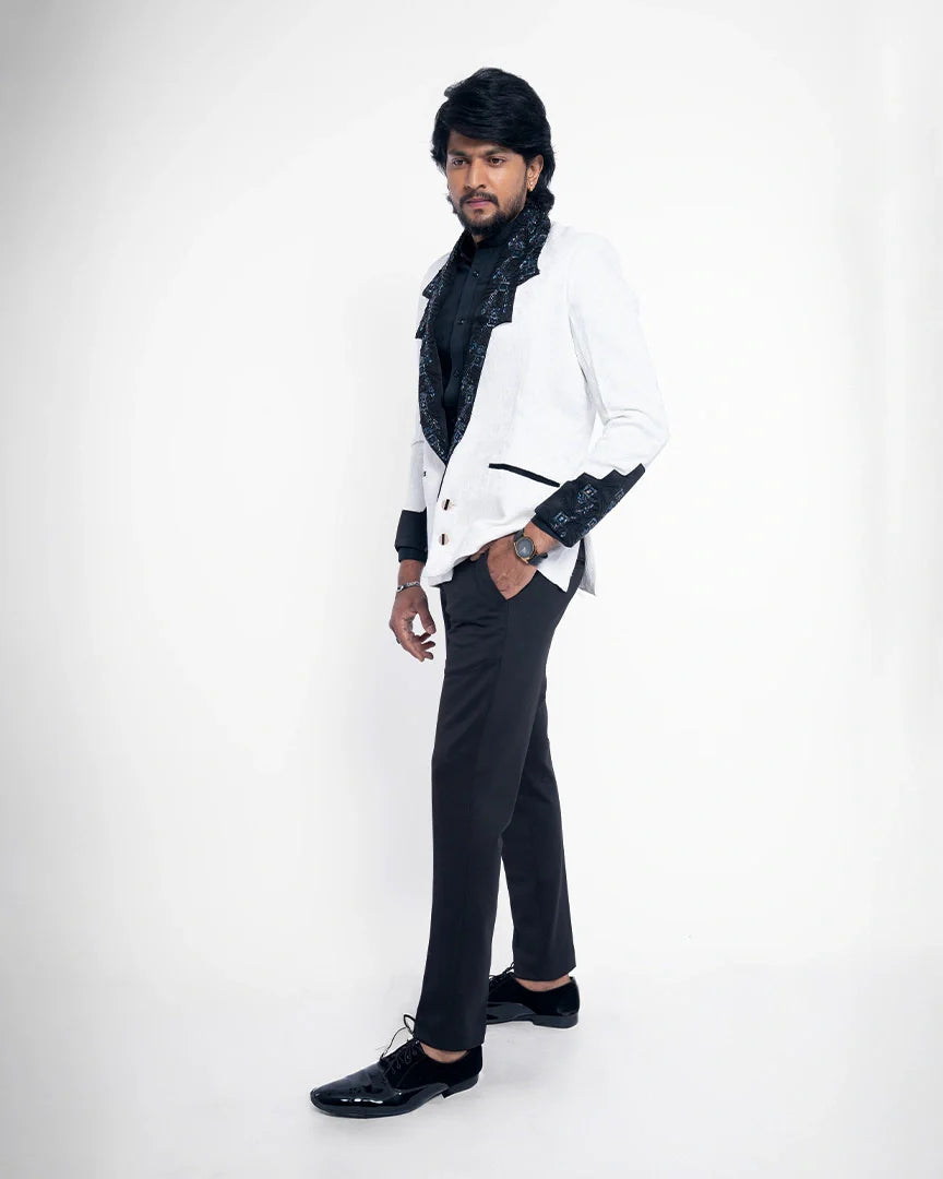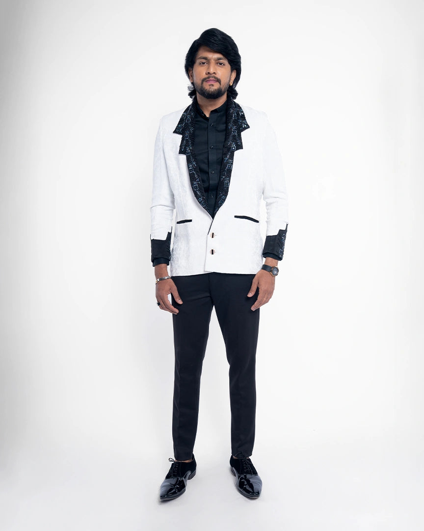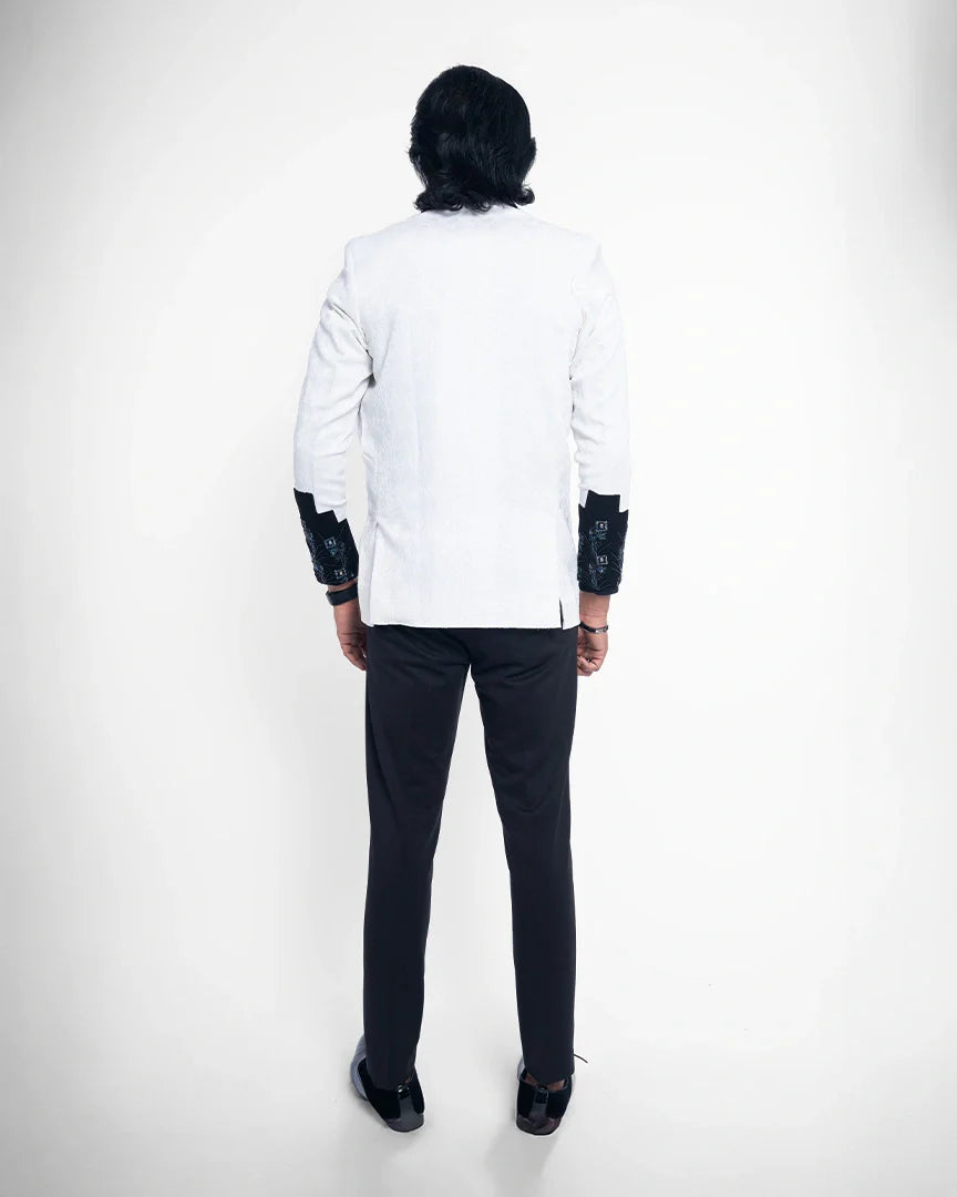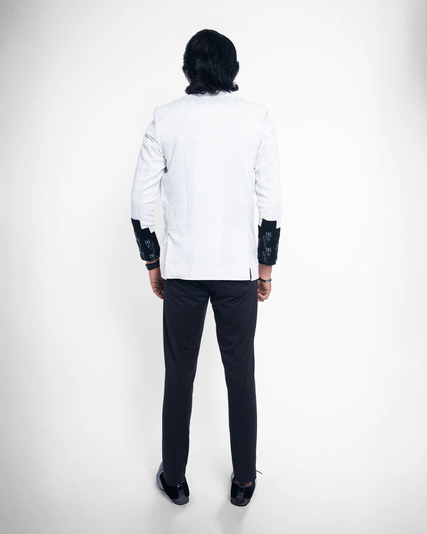 Elegant sophistication defines this white blazer and suit set, beautifully adorned with intricate aari embroidery. A seamless blend of modern tailoring and timeless craftsmanship.