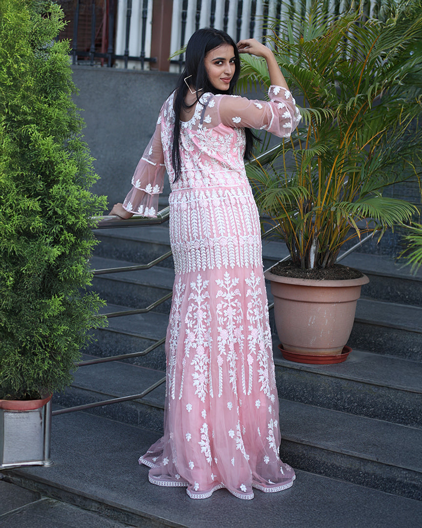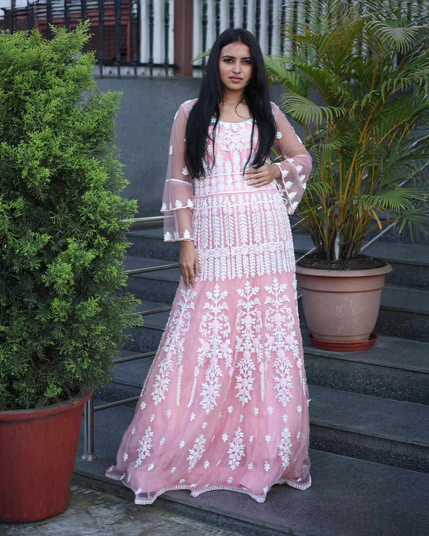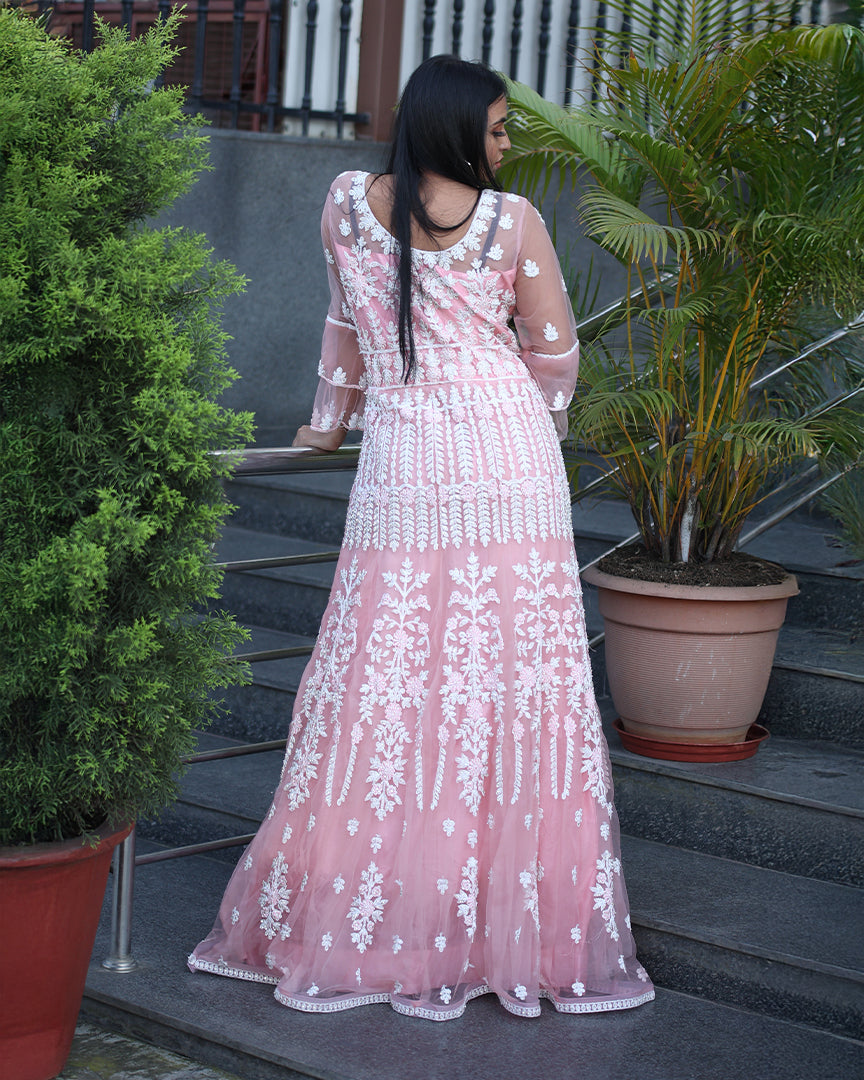 Graceful and eye-catching, this peach crystal embellished gown is perfect for family functions and festive gatherings. With its soft shade and elegant detailing, it’s designed to bring charm without overpowering the moment.