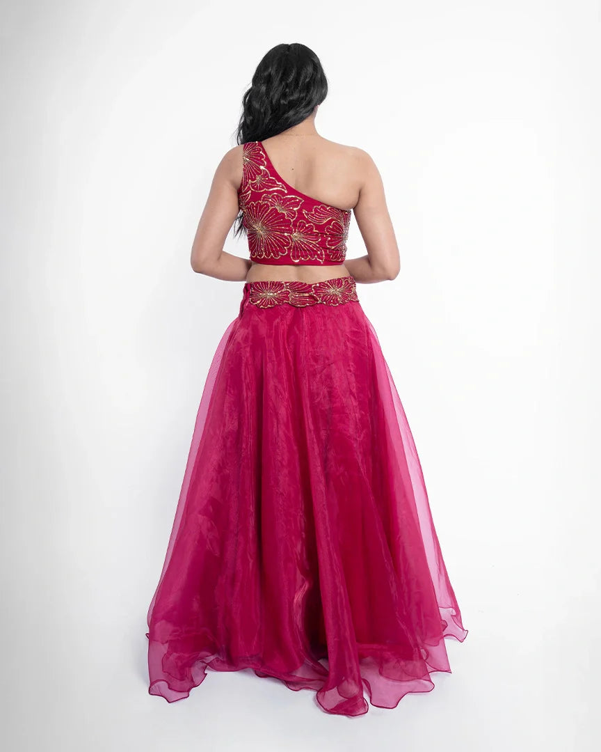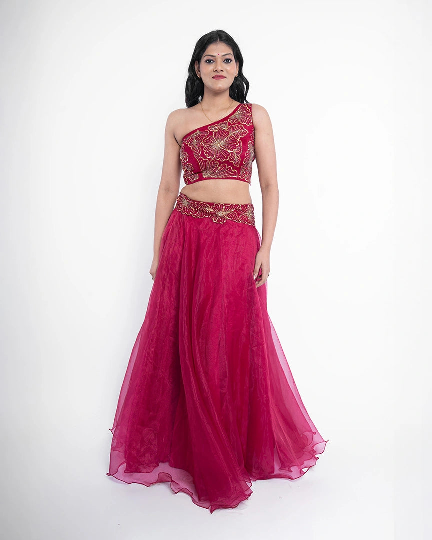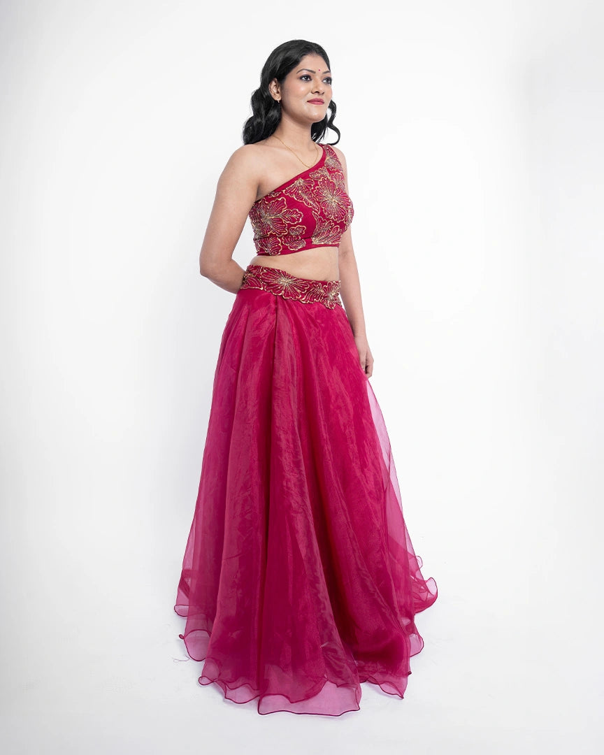 Make a statement in this stunning blood red ensemble, elevated with rich golden embroidery that captures elegance and festive grandeur effortlessly.