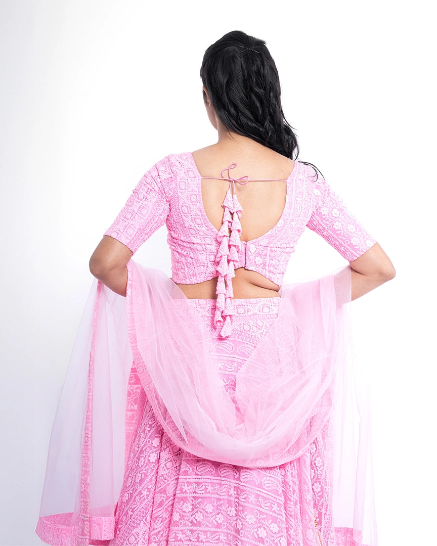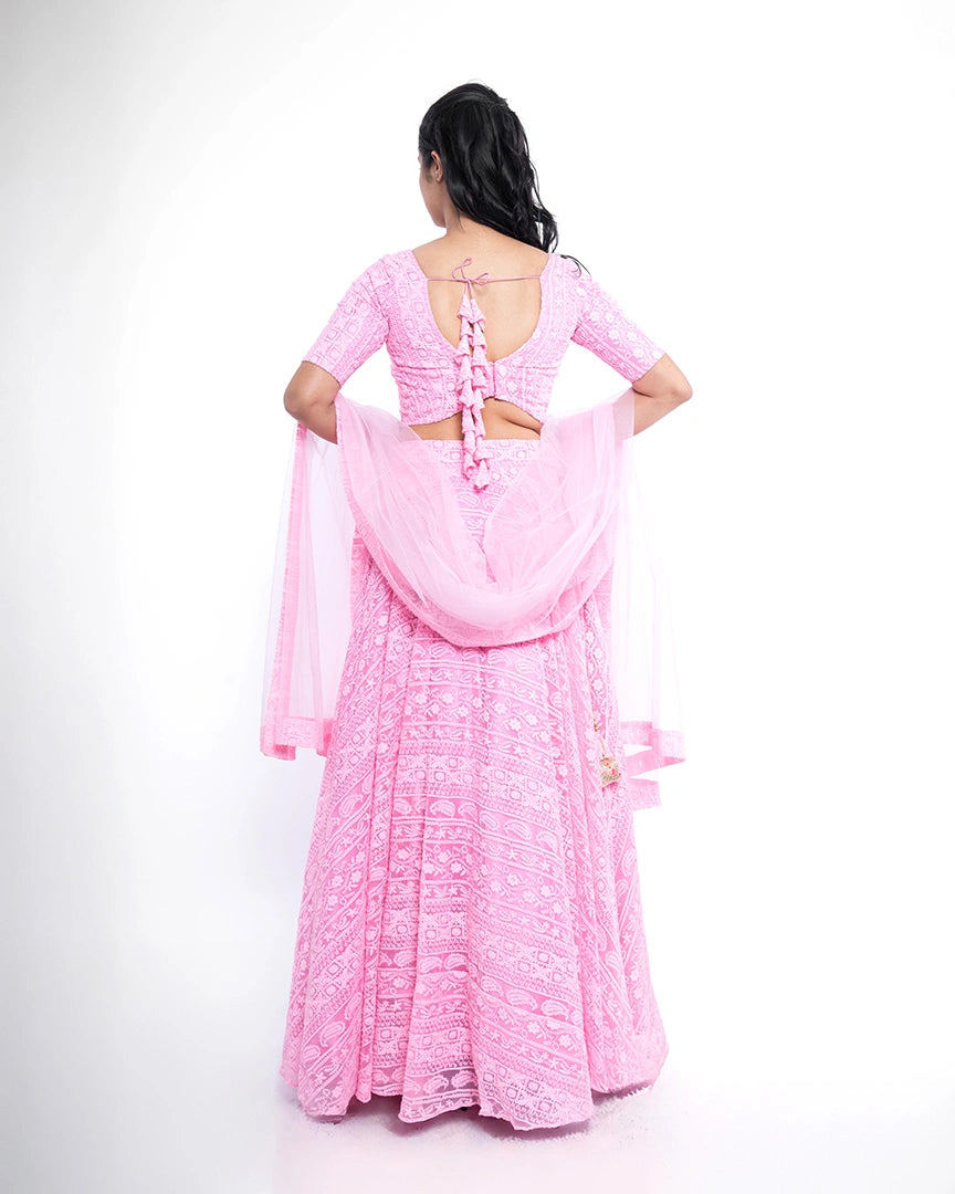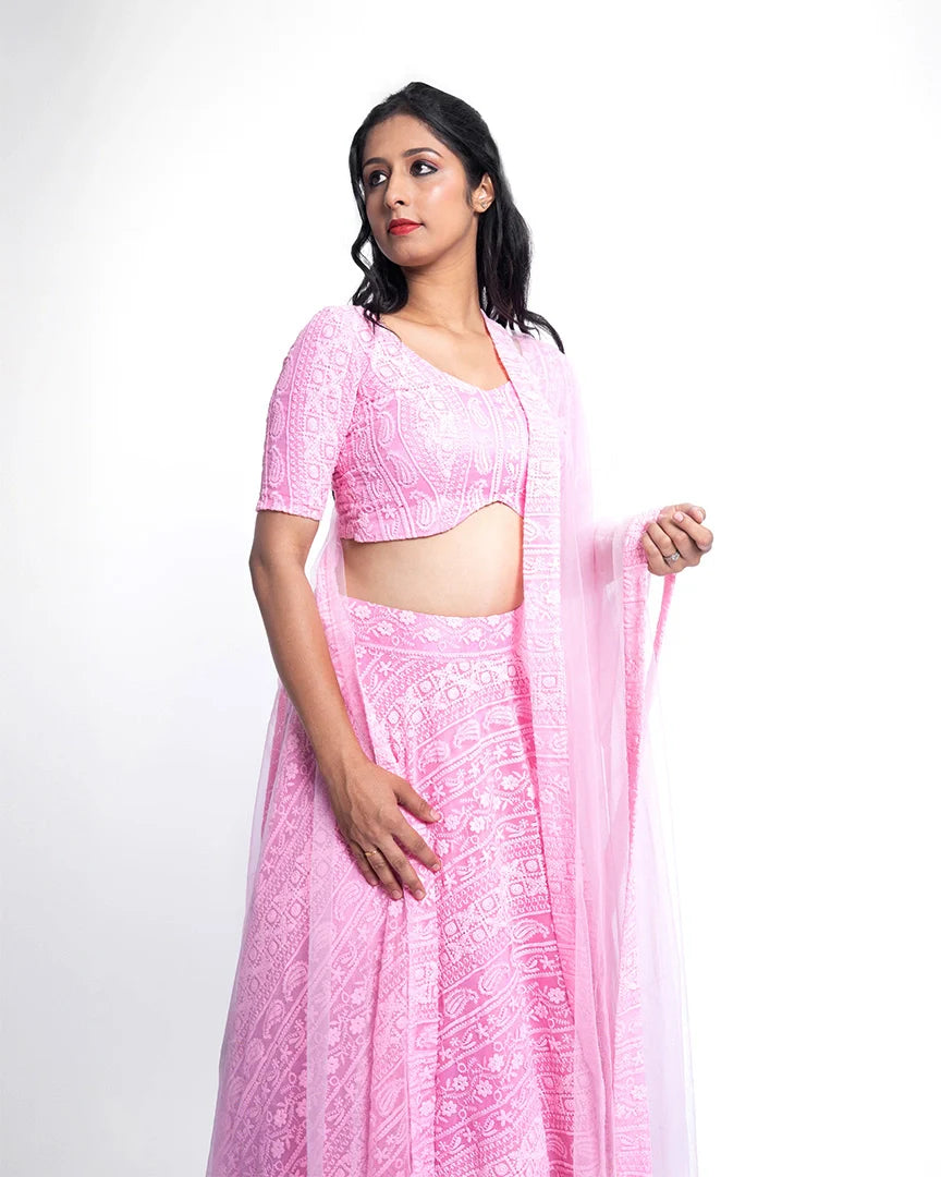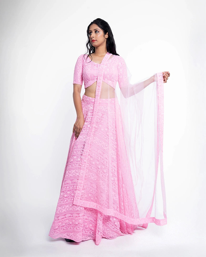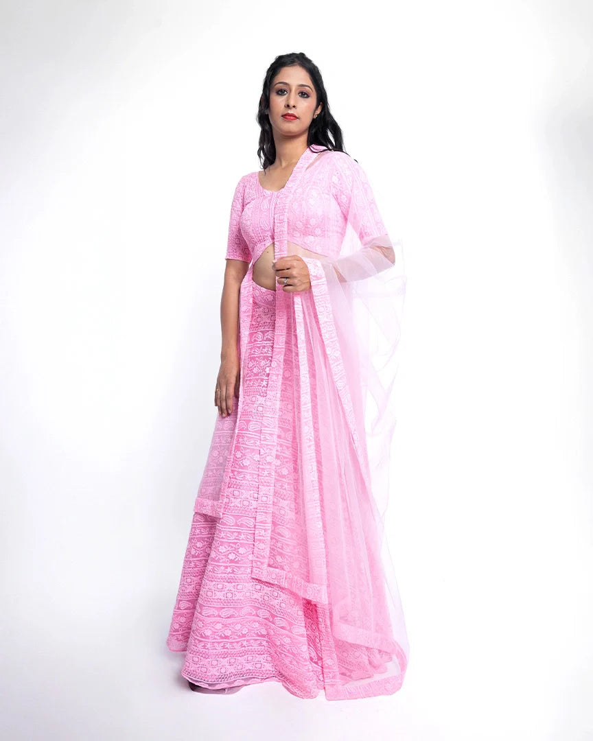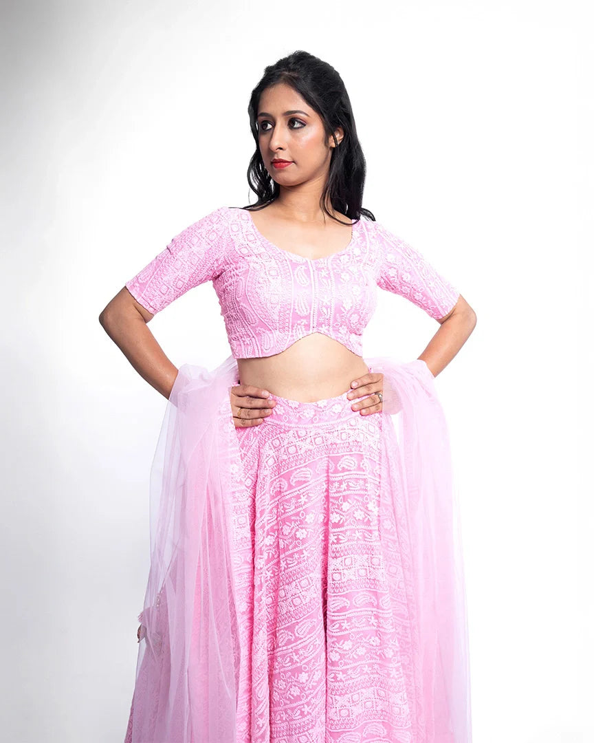 Feel like a dream in this soft pink lehenga, exquisitely adorned with delicate chikankari embroidery — an ethereal look that radiates grace and timeless charm.