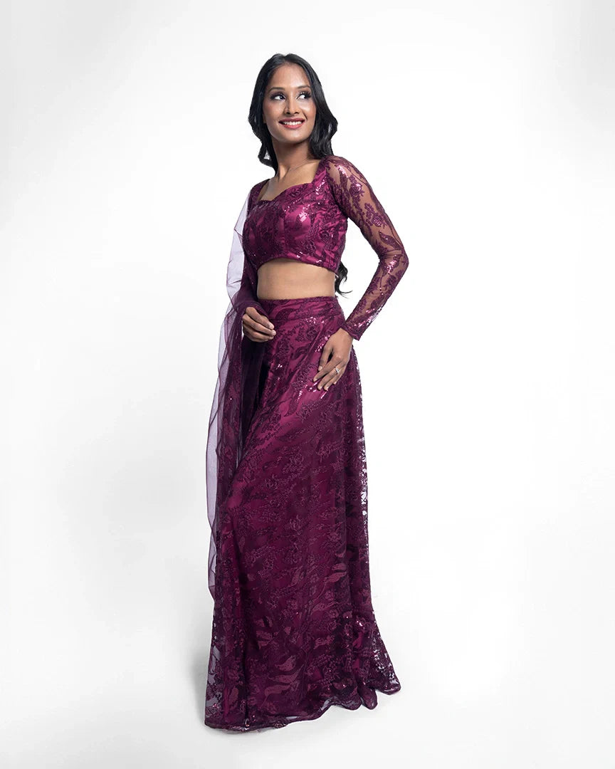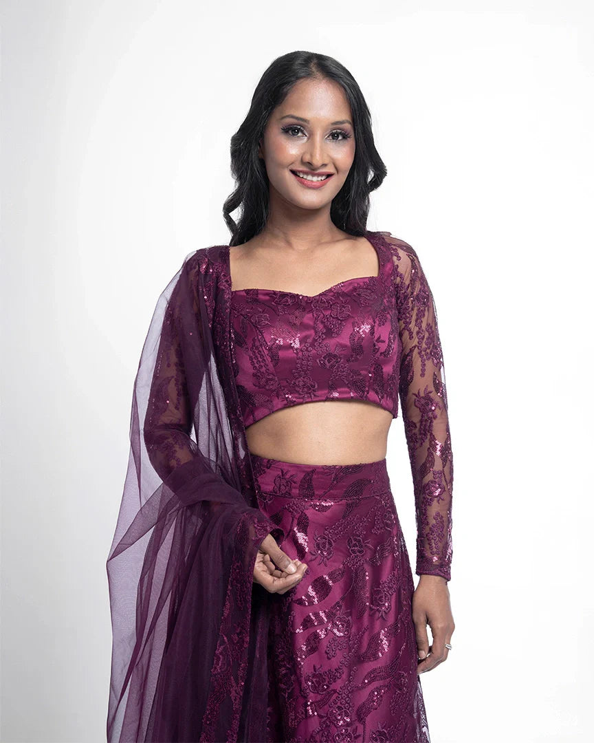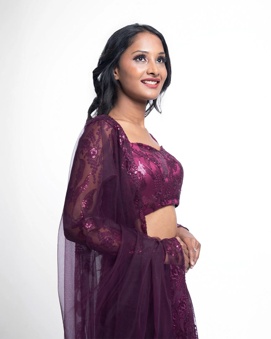 Wine elegance meets sequinned luxury in this stunning lehenga set, complete with a sweetheart neckline that adds charm and sophistication to every step.
