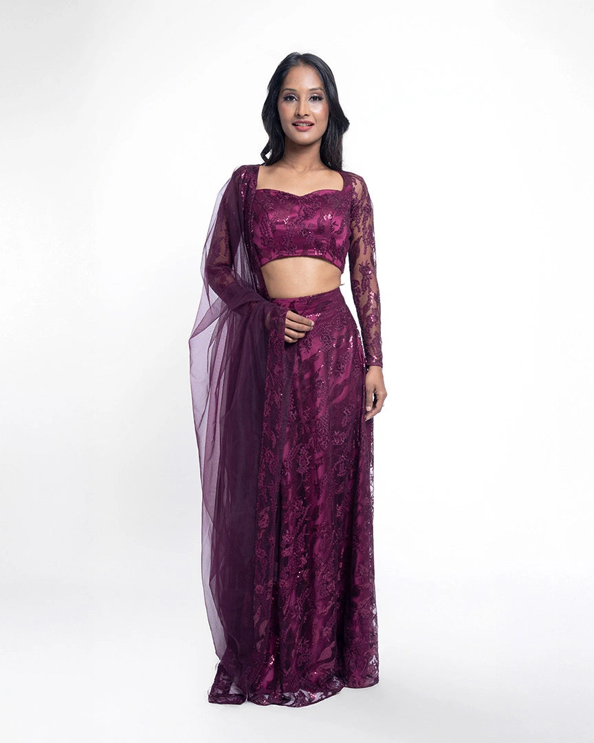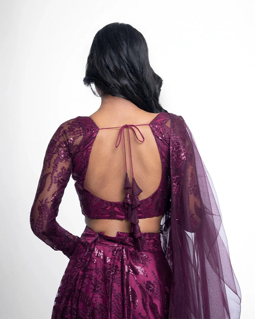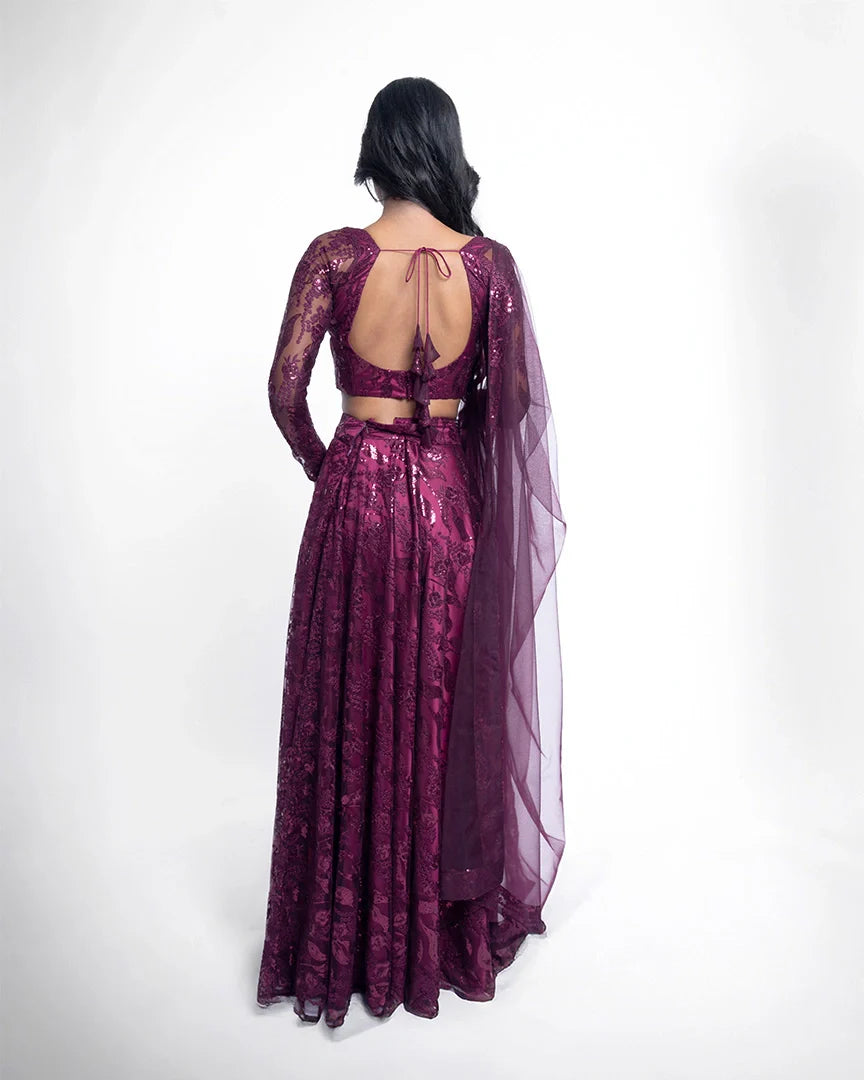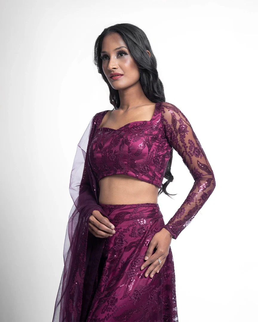 Wine elegance meets sequinned luxury in this stunning lehenga set, complete with a sweetheart neckline that adds charm and sophistication to every step.