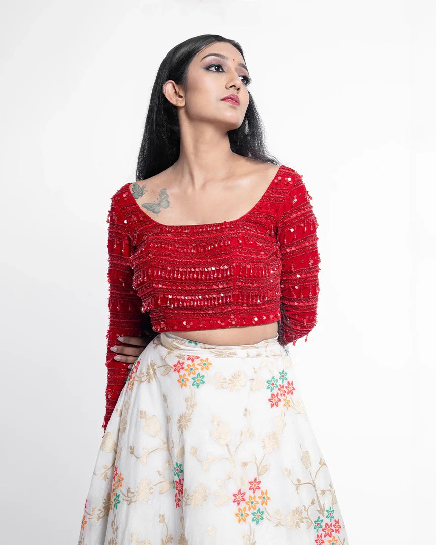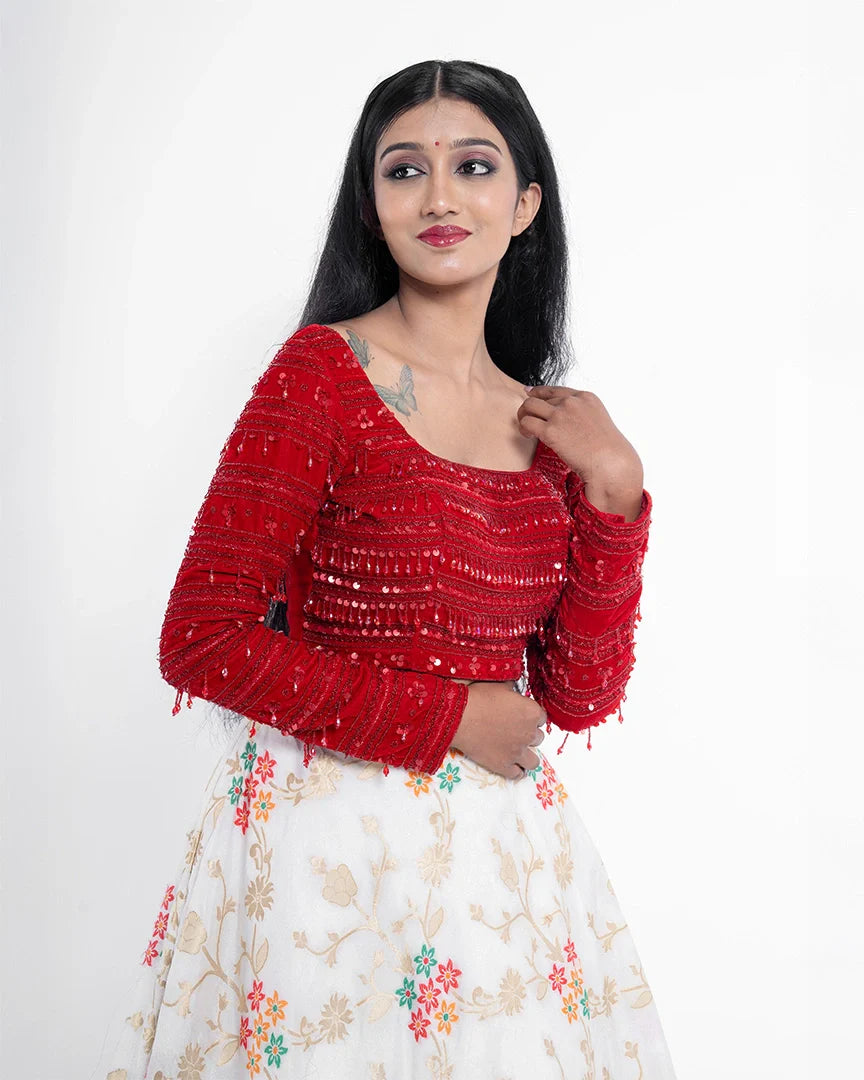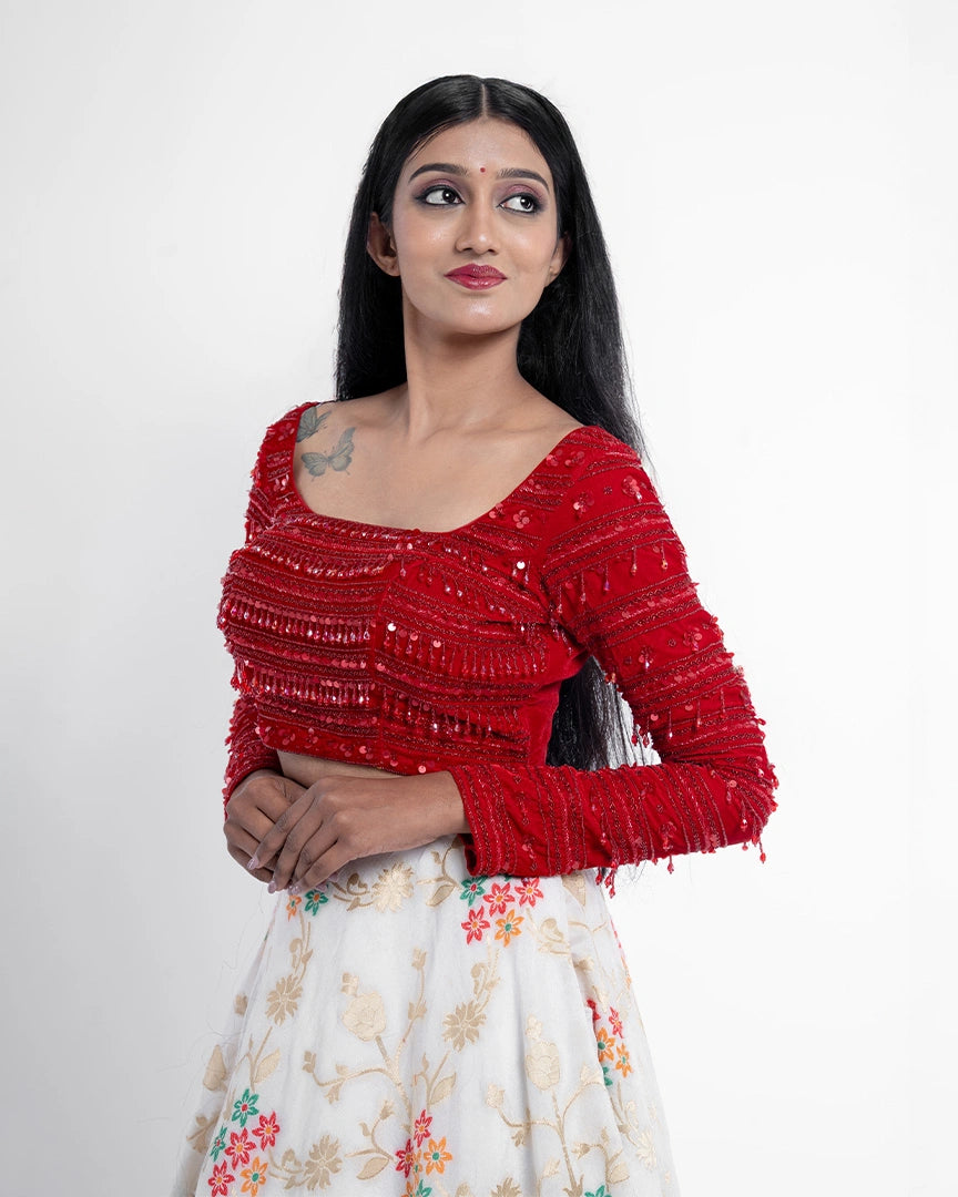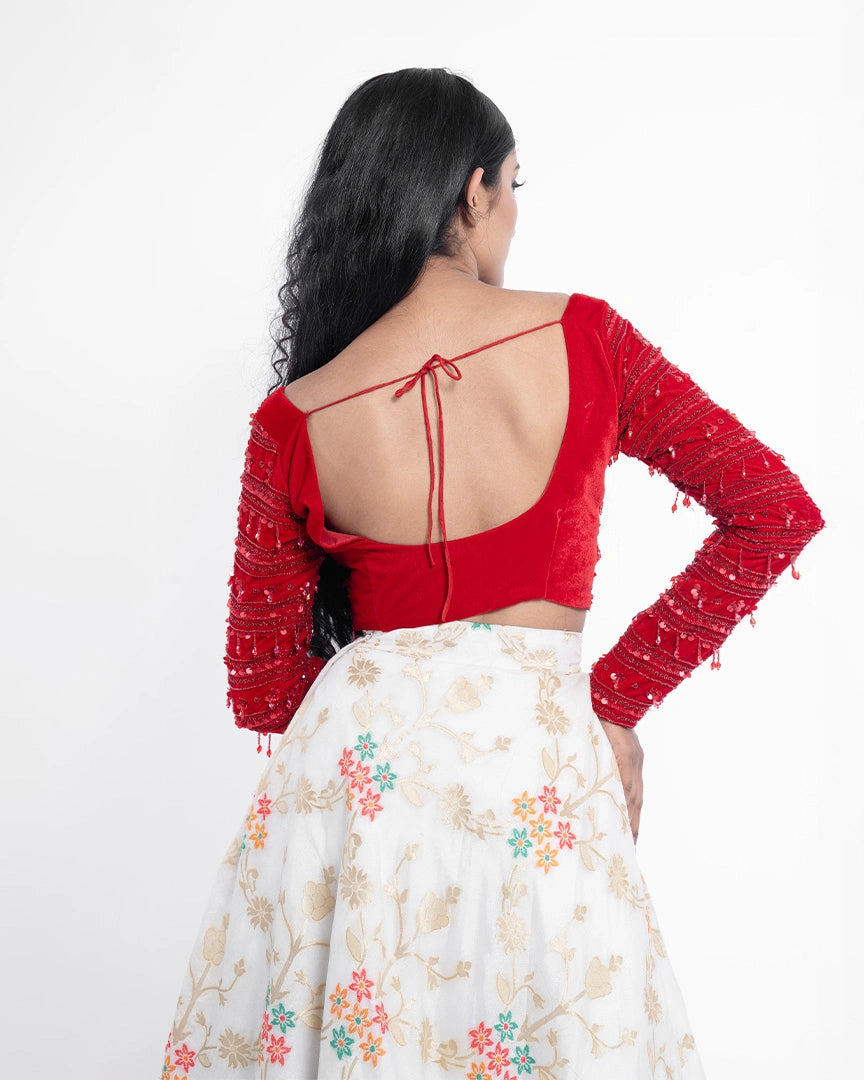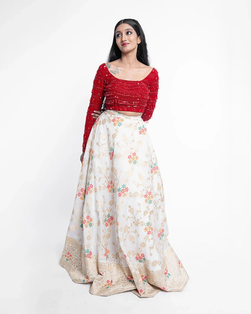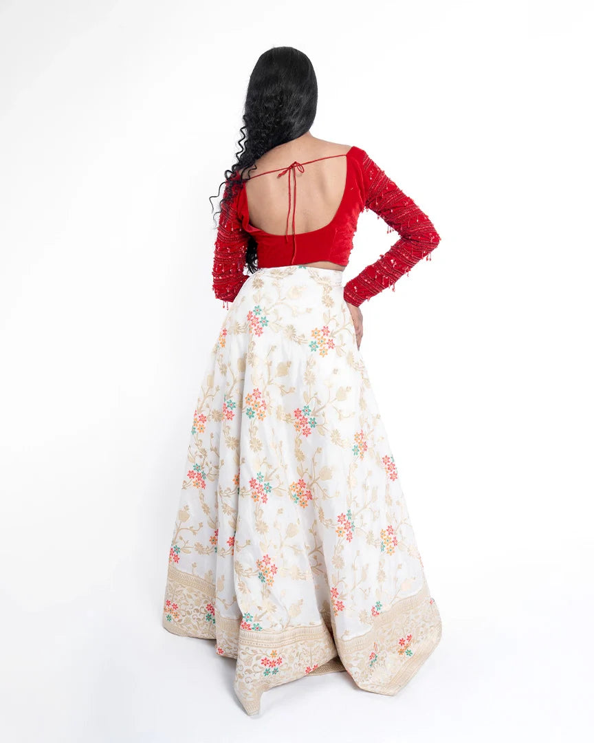 An elegant fusion of rich white Banarasi silk and deep red velvet, this lehenga is adorned with intricate aari work — a royal masterpiece made for modern-day queens.