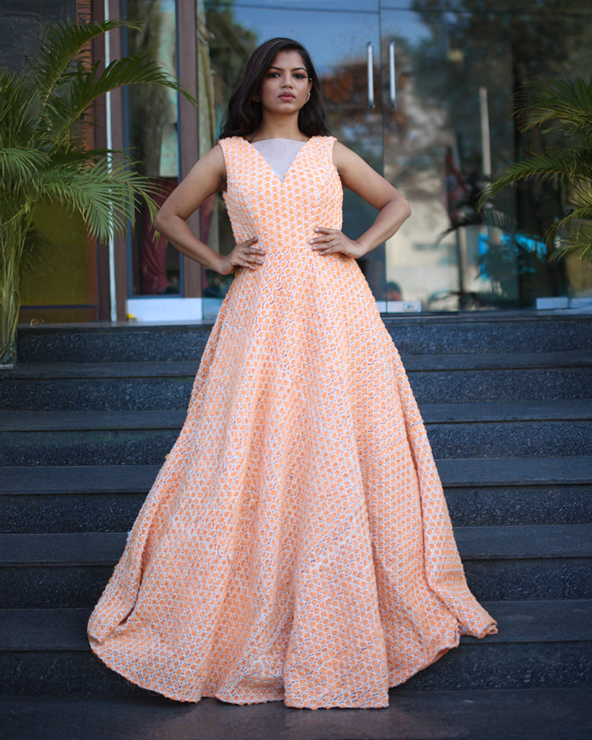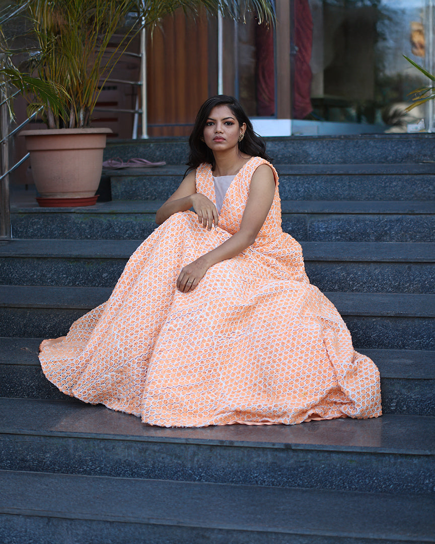 Bright and breezy, this sleeveless gown in a refreshing orange shade is beautifully detailed with a soft floral pattern. It’s a cheerful pick for casual celebrations and sunny day events.