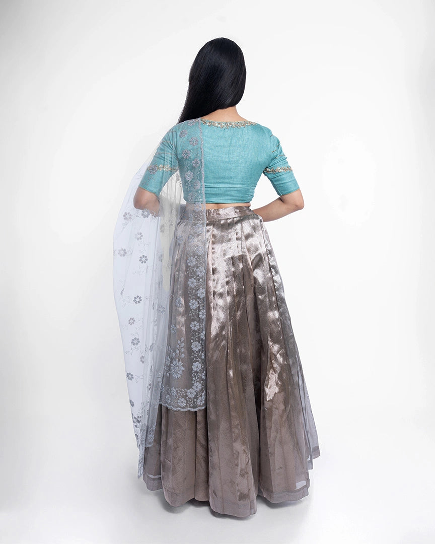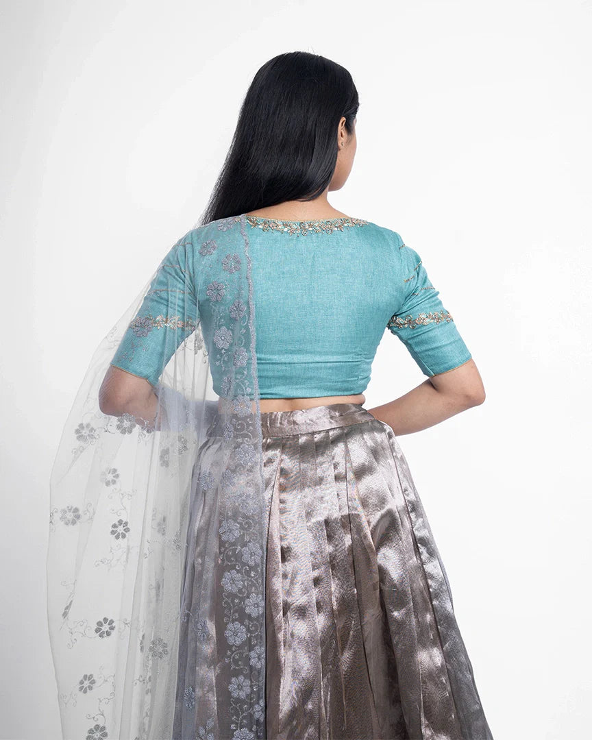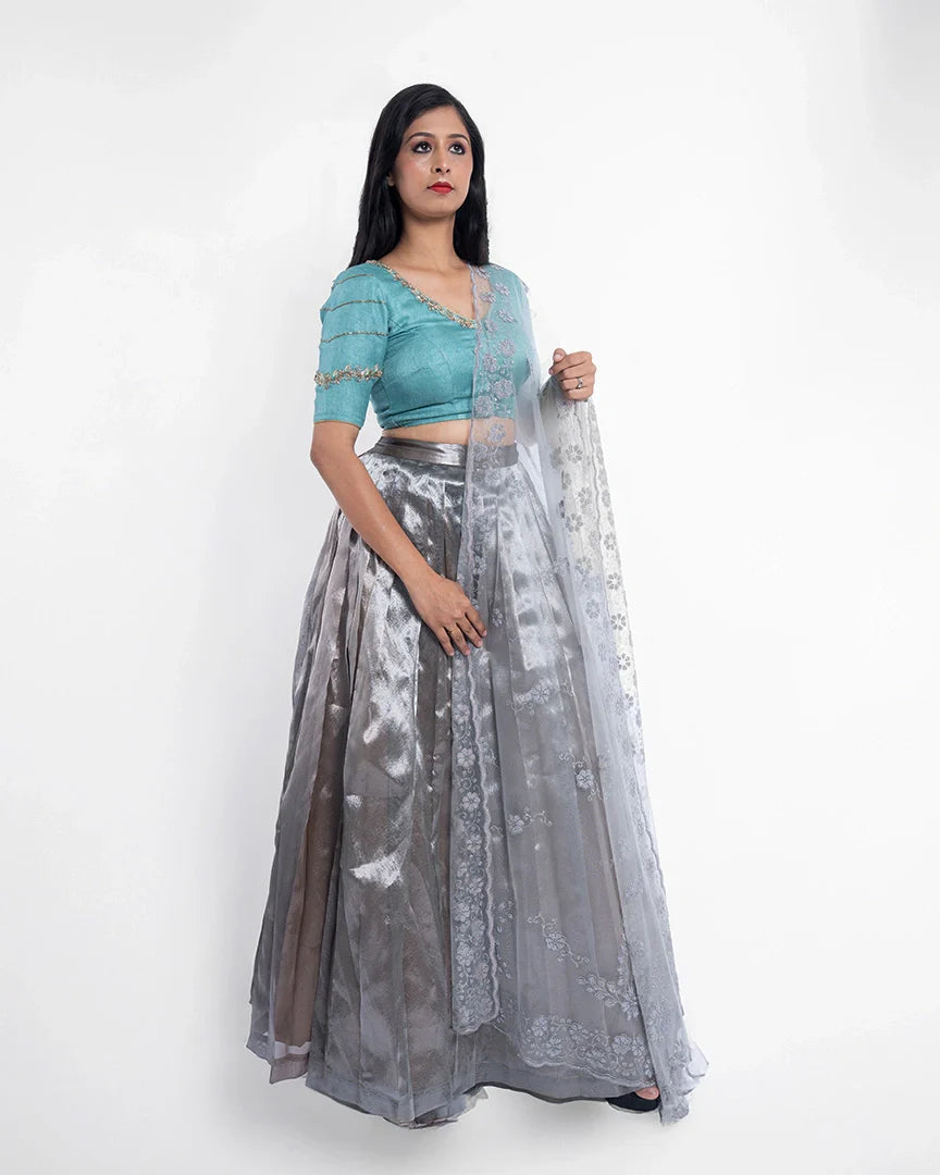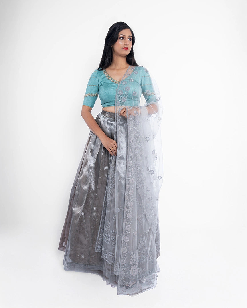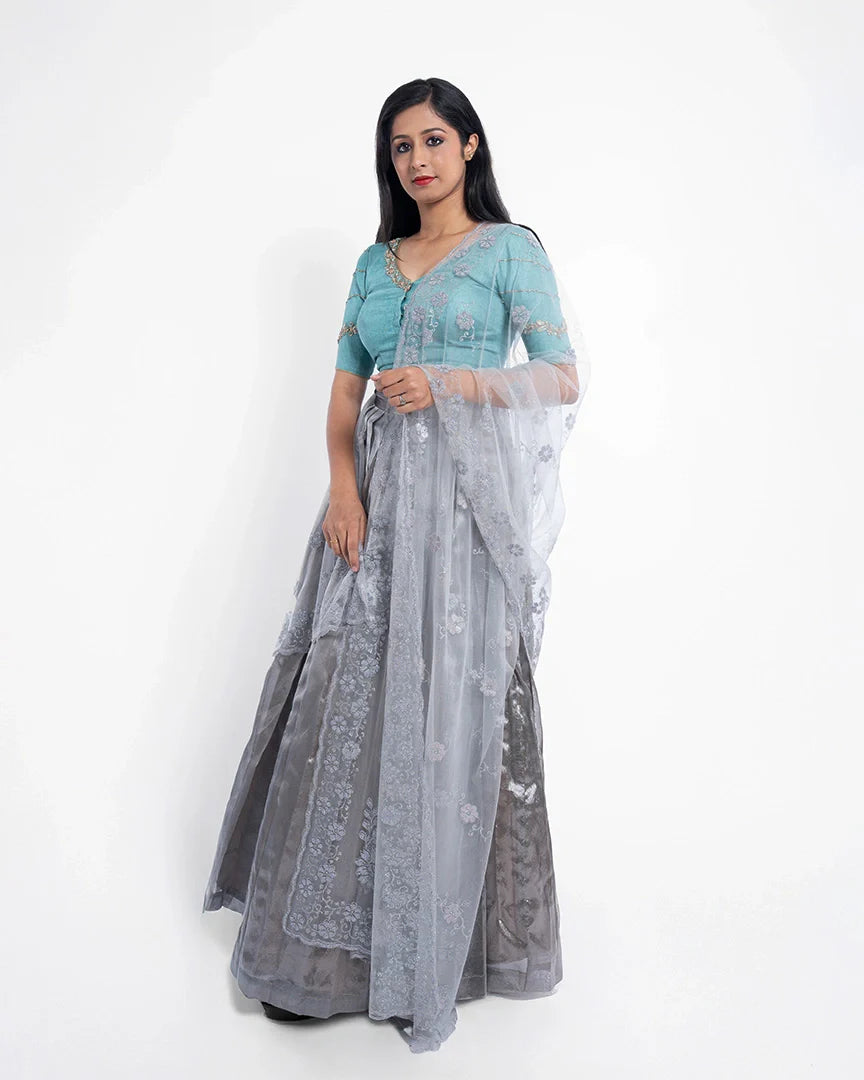 Light, luminous, and luxe — this lehenga is your go-to for understated elegance with a sparkle.