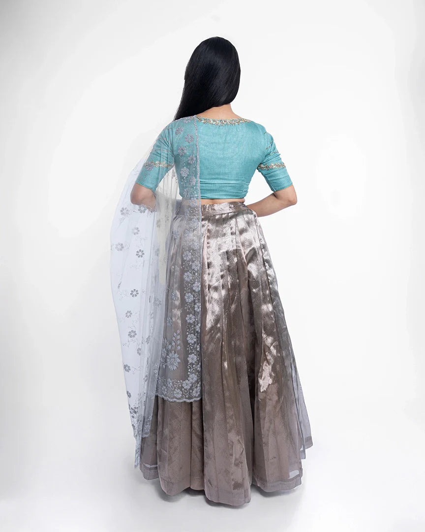 Shine bright in this stunning lehenga crafted with intricate aari work and layers of flowing organza — made for elegant entrances and graceful twirls.