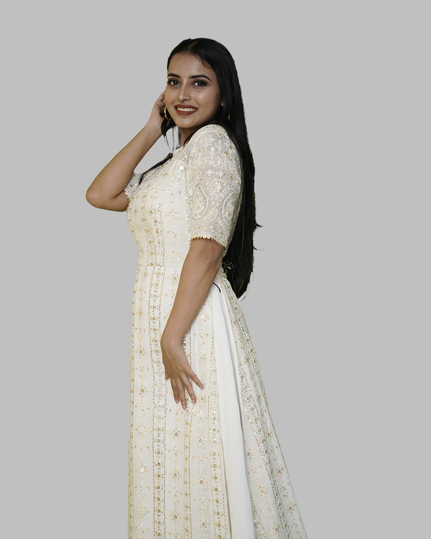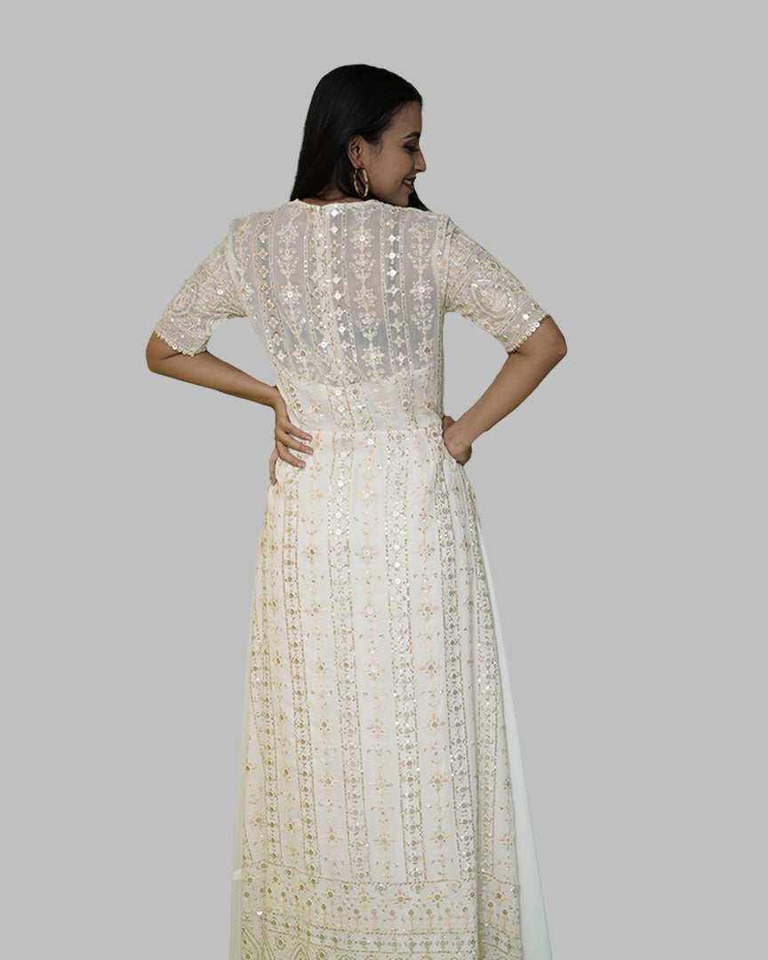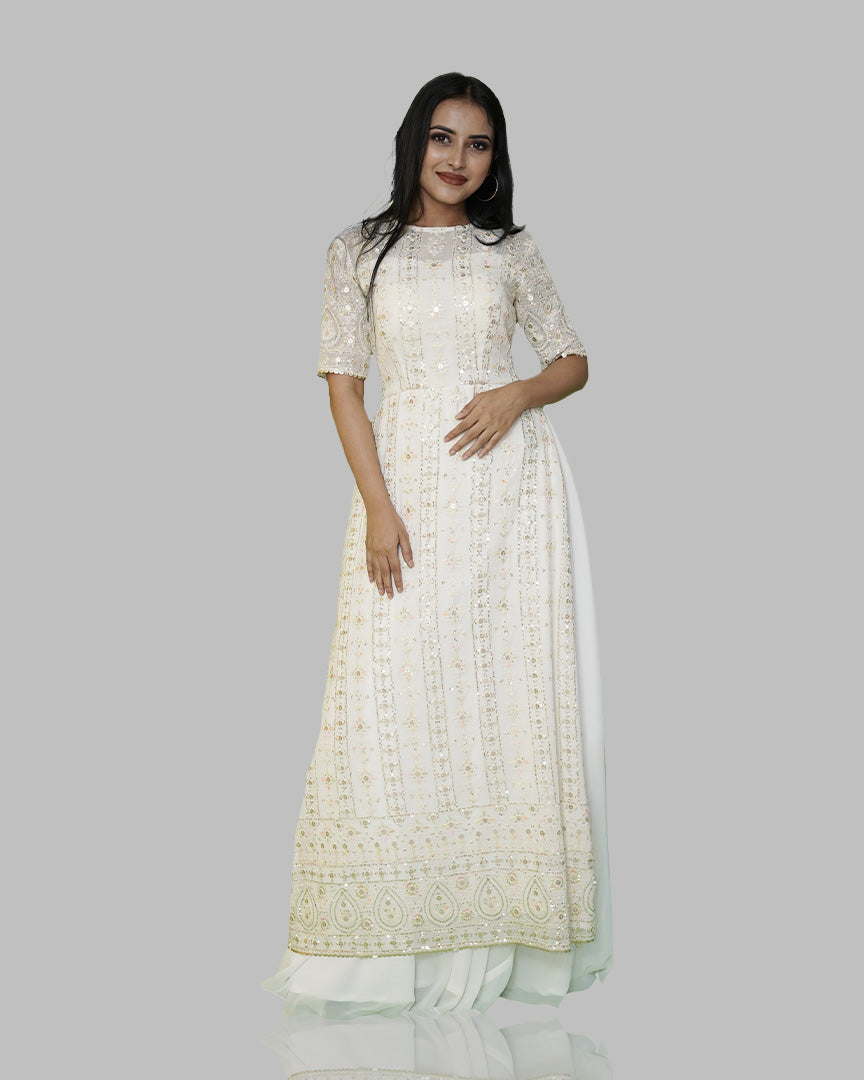 Subtle, serene, and full of charm, this half white kurta set with fine thread embroidery reflects elegance in every detail. Paired with a matching palazzo, it's a graceful choice for festive mornings and cultural gatherings.