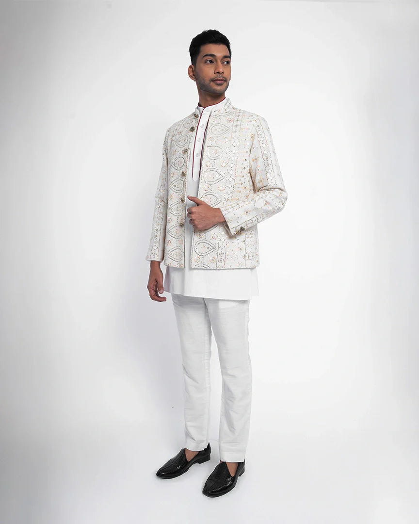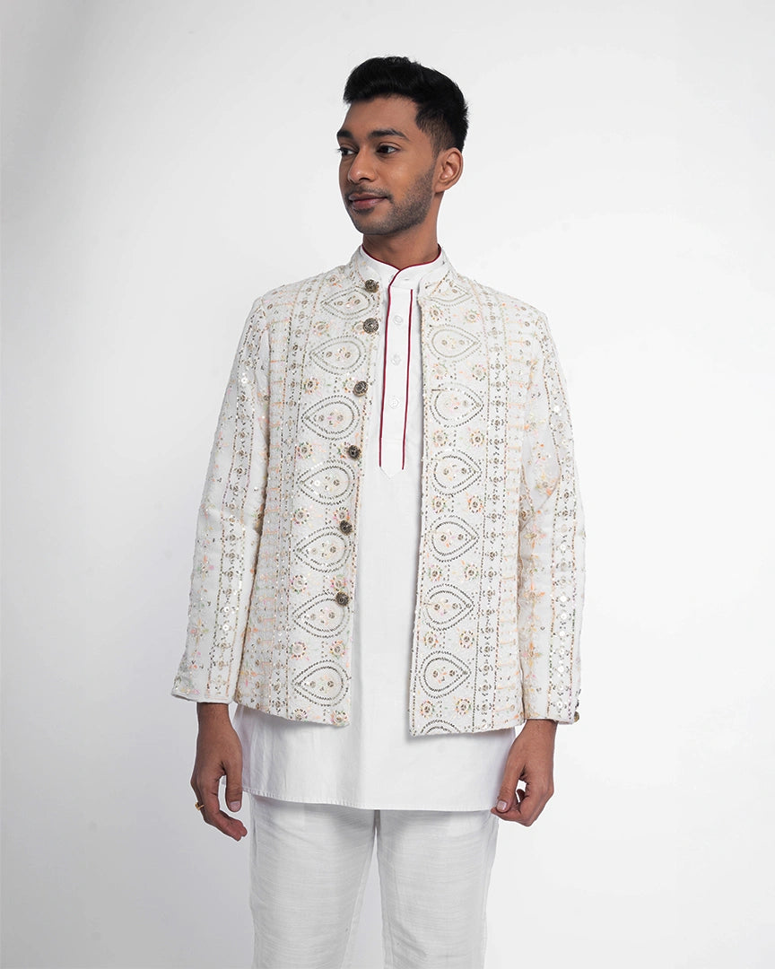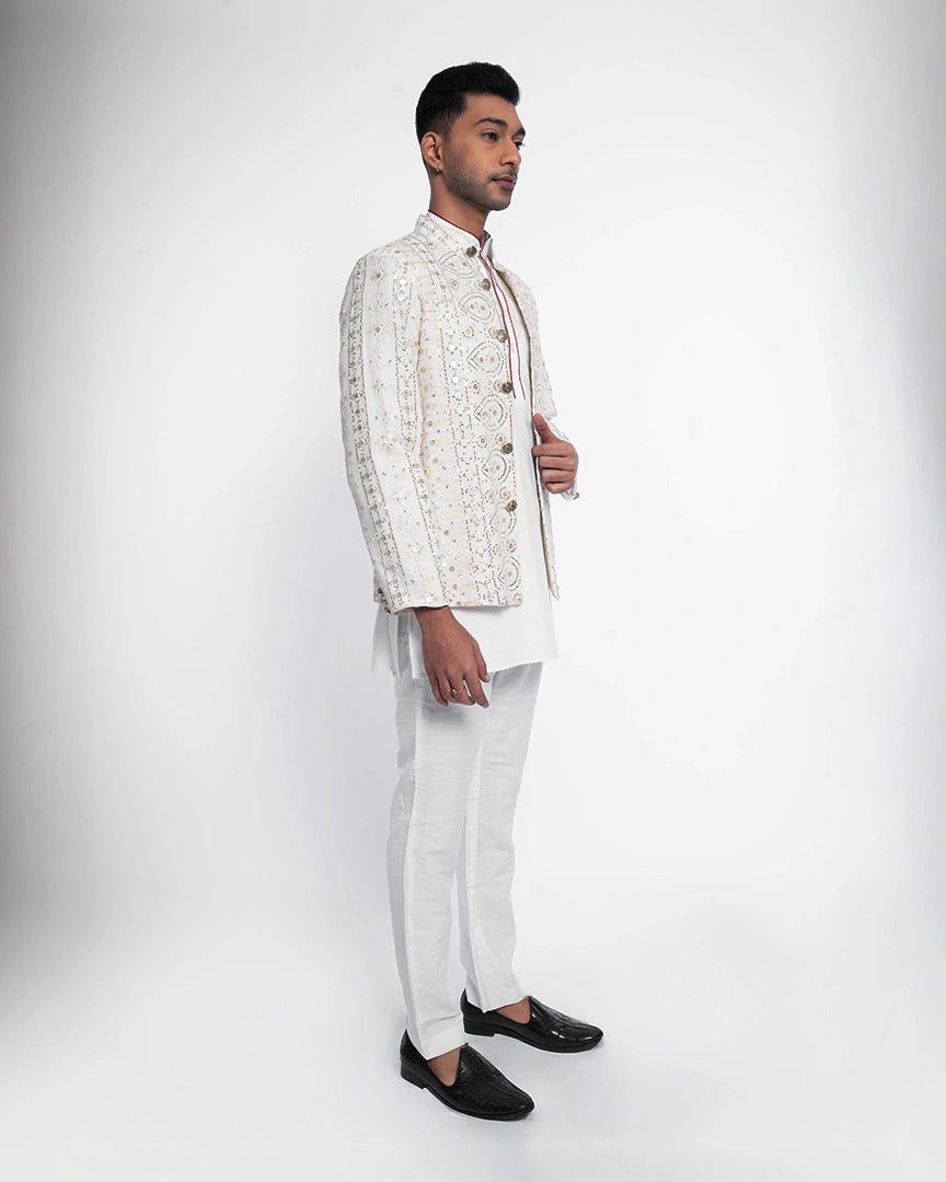 Make a dazzling impression in this stunning white suit adorned with intricate embroidery and shimmering sequins. Designed to stand out while keeping it effortlessly elegant.