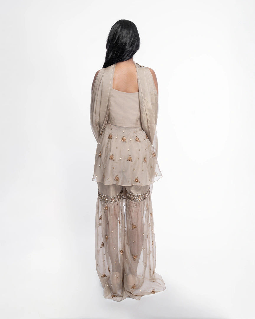 Dazzling style comes to life in this elegant sharara set, featuring intricate aari work and a modern flair that makes tradition feel runway-ready.