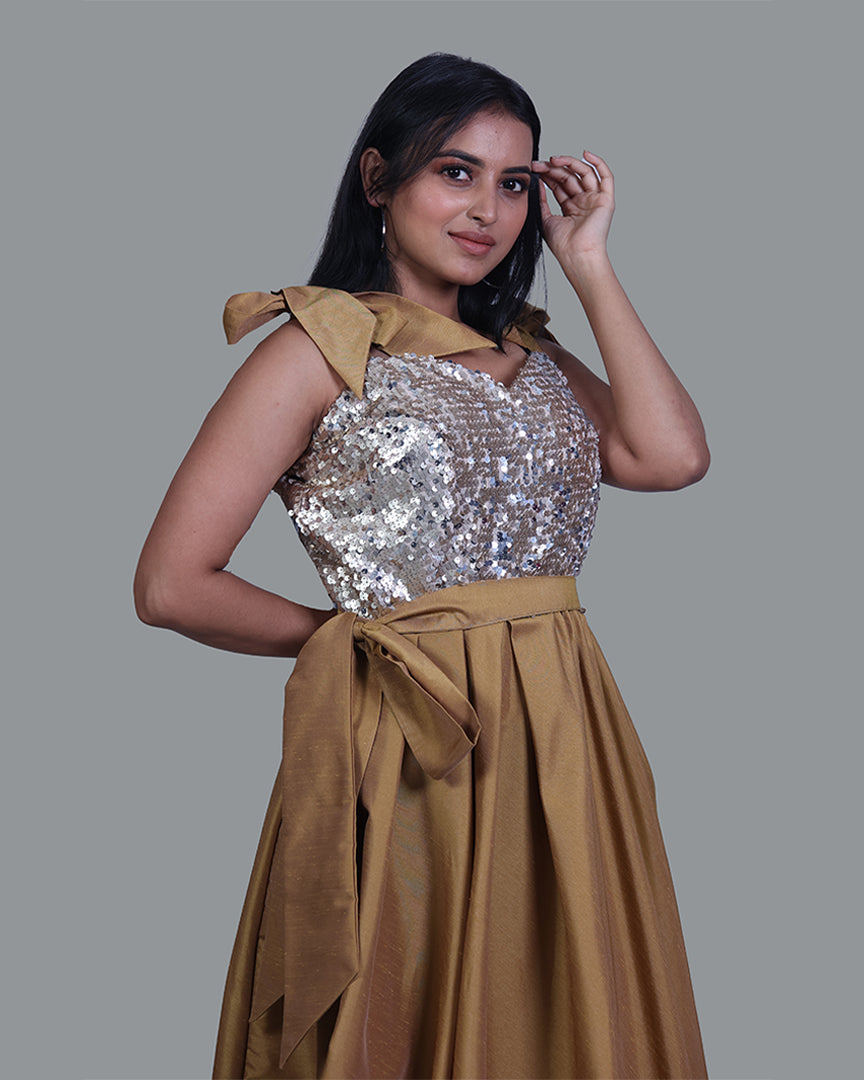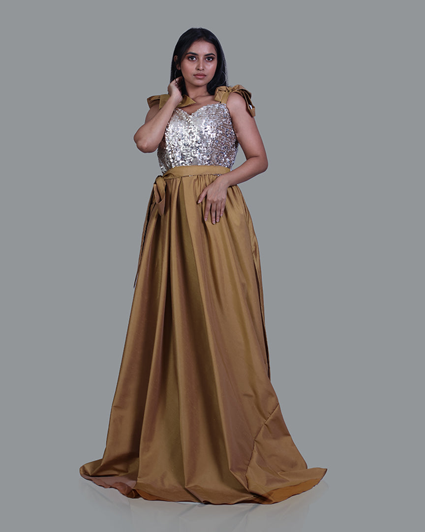 This stunning mustard western gown features a glamorous sequin-embellished yoke and delicate straps — designed to make you shine at any party. Flowy, flattering, and full of personality, it’s an eye-catching evening choice.