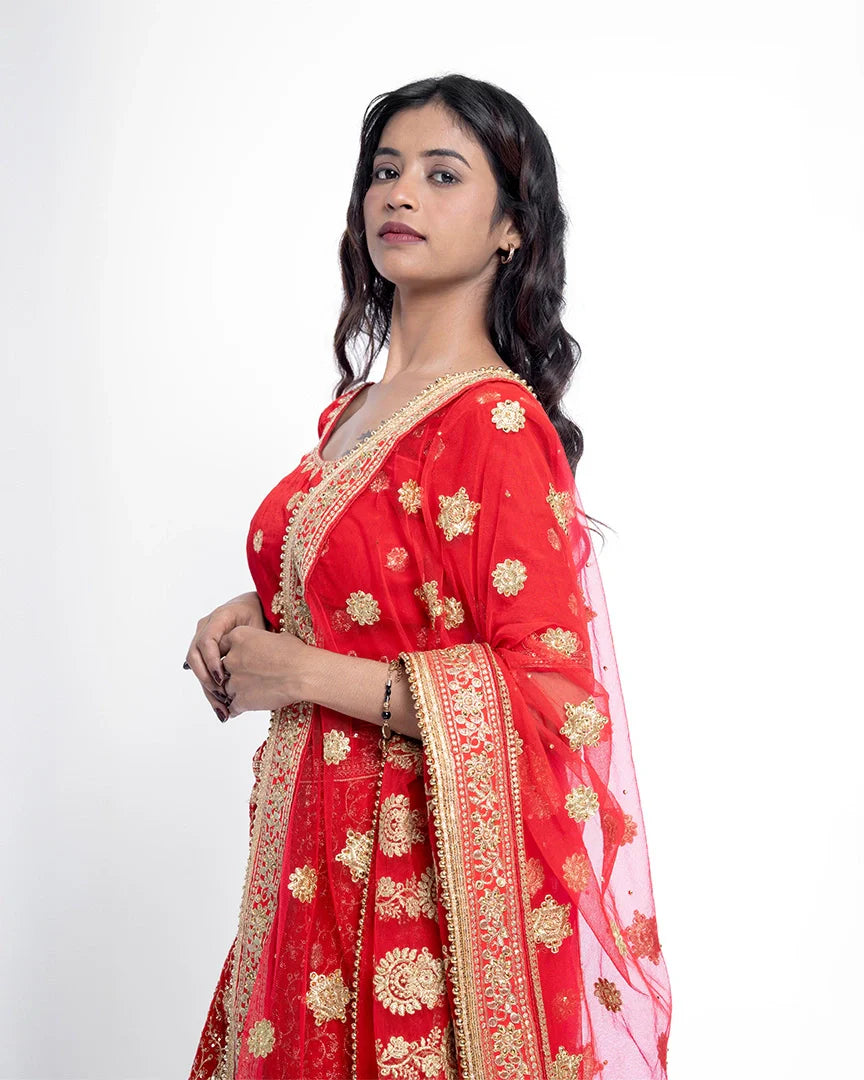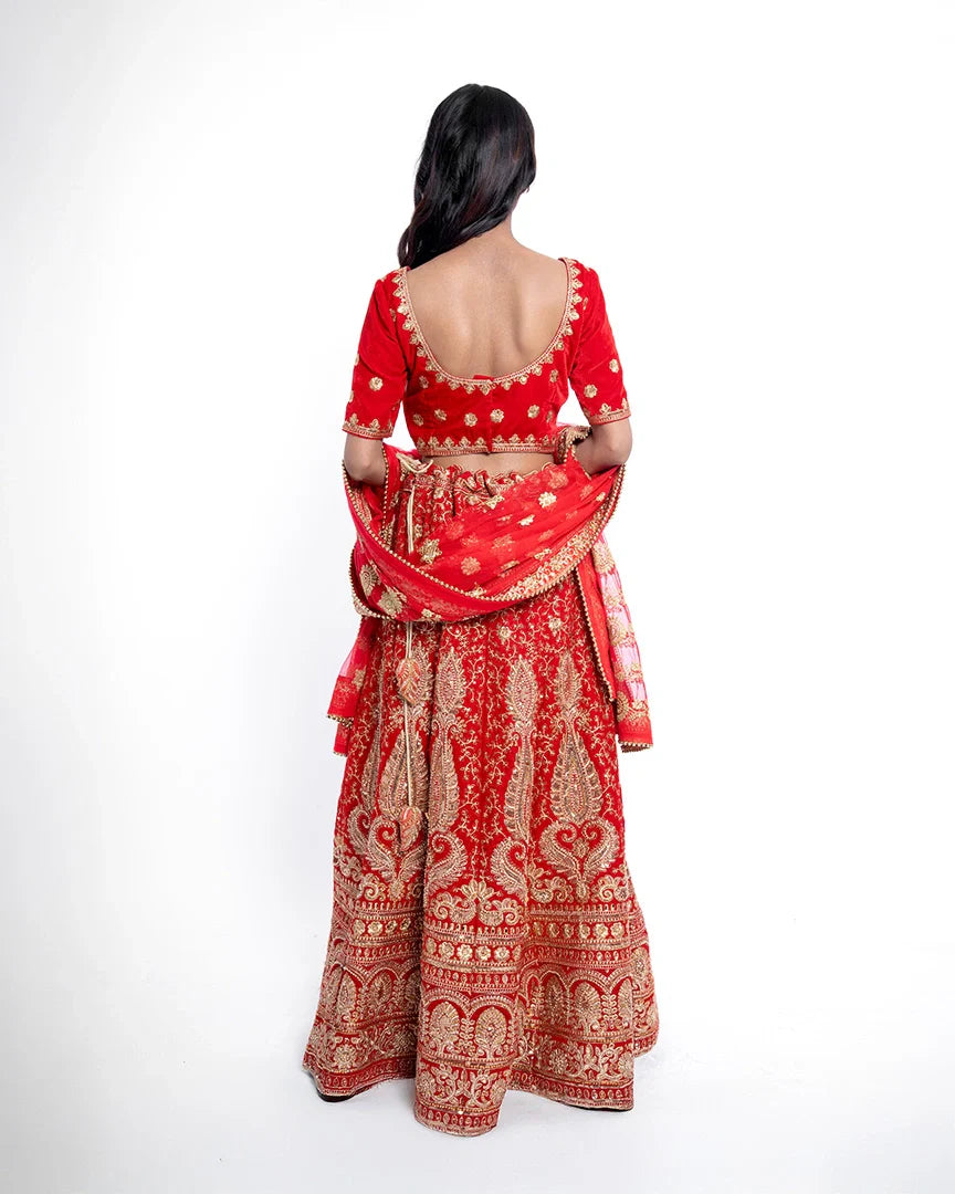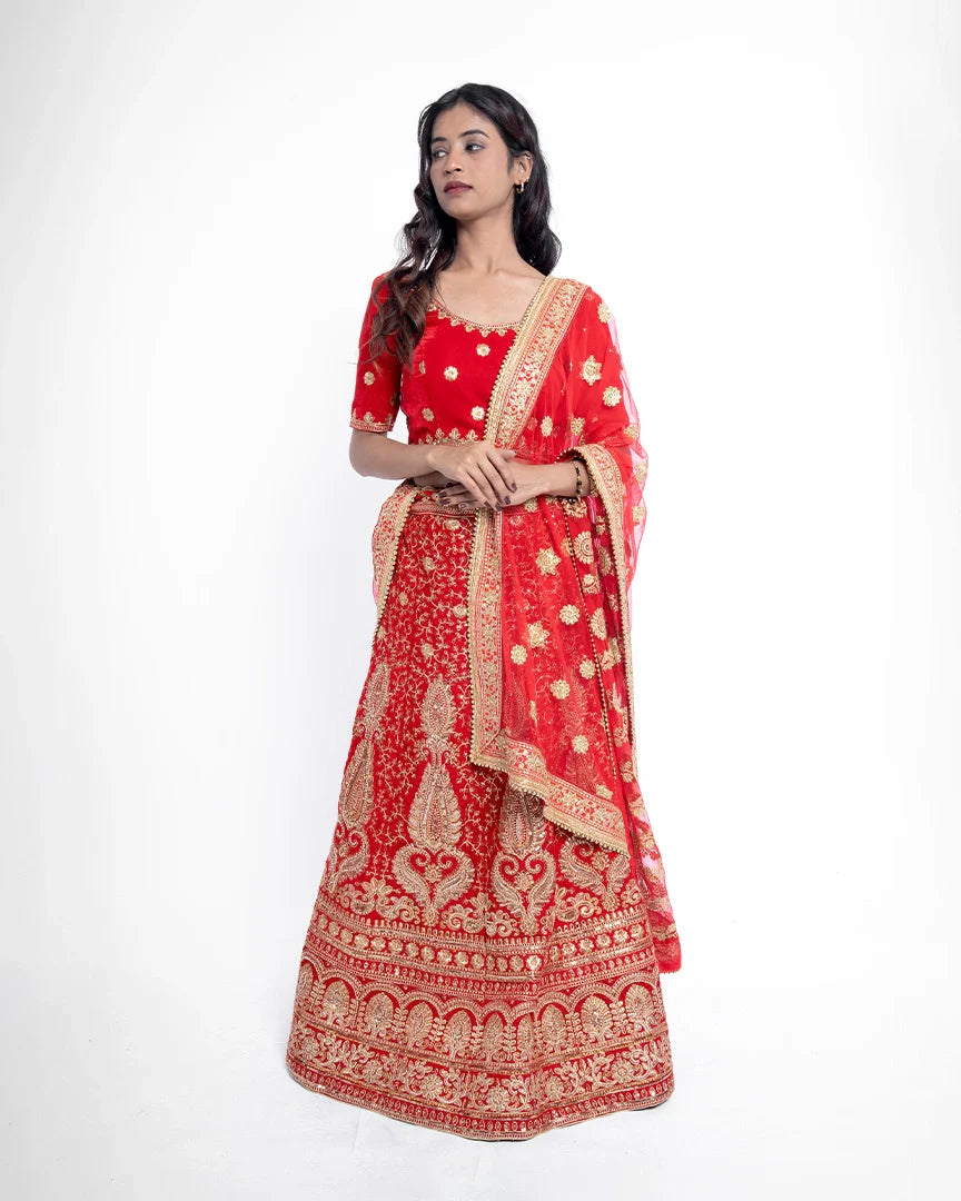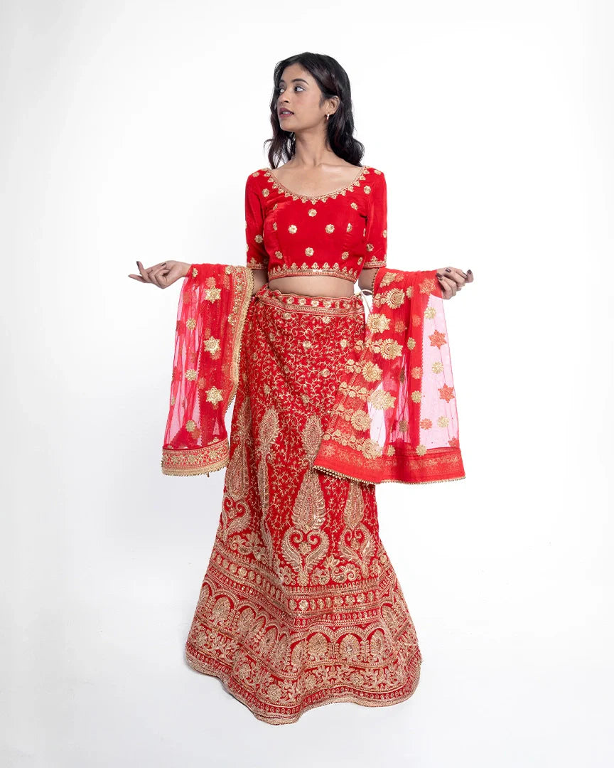 Majestic and timeless — this red bridal lehenga is adorned with golden splendor, capturing the essence of royal weddings and unforgettable bridal grace.