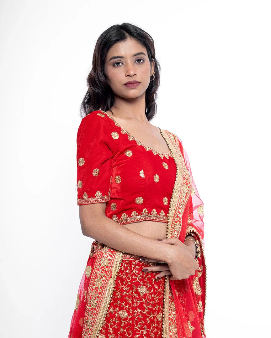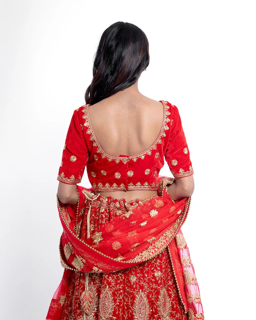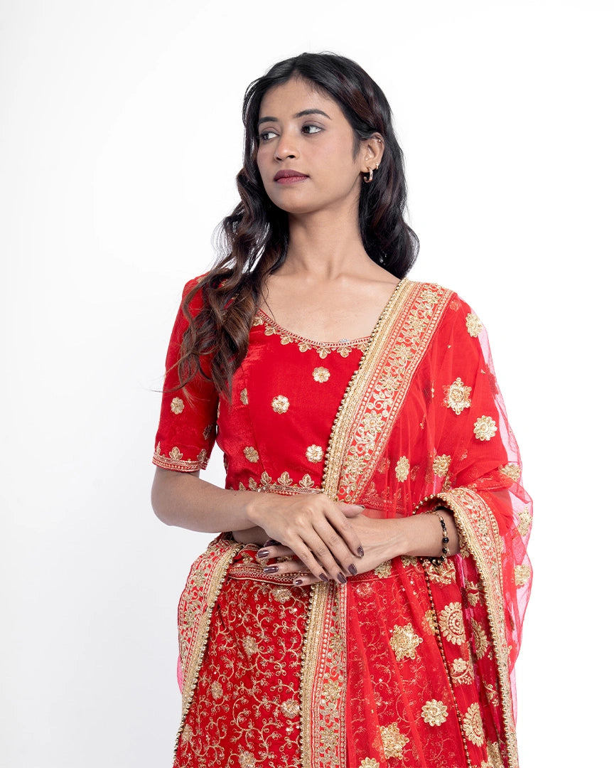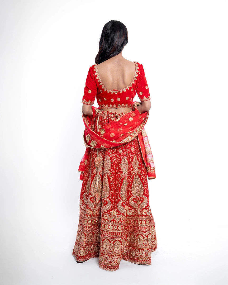 Majestic and timeless — this red bridal lehenga is adorned with golden splendor, capturing the essence of royal weddings and unforgettable bridal grace.