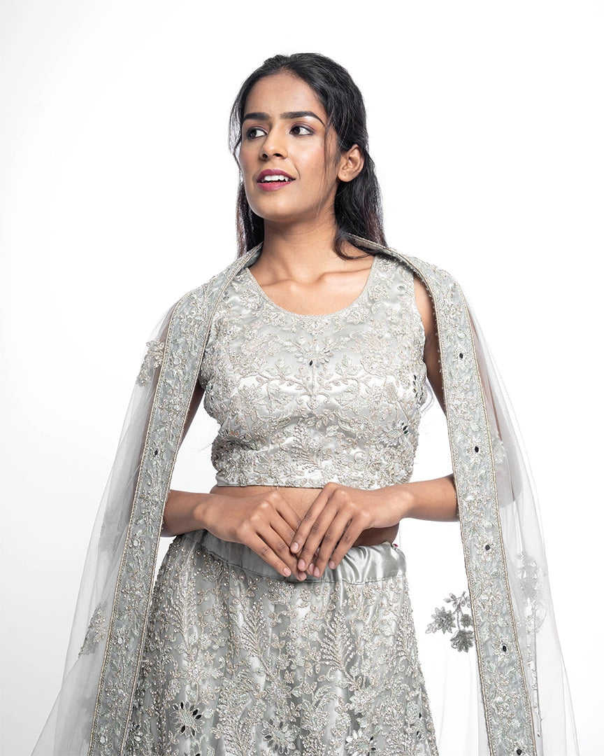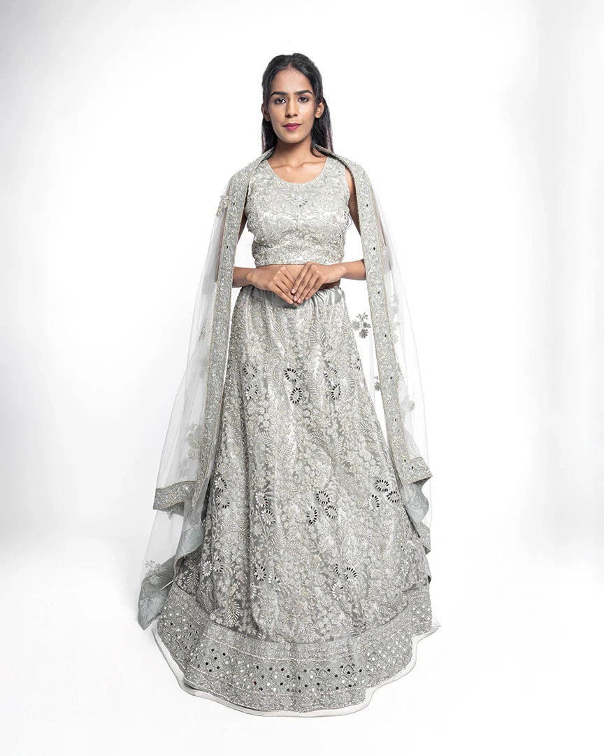 Design: Full-flared lehenga with matching blouse and sheer dupatta
