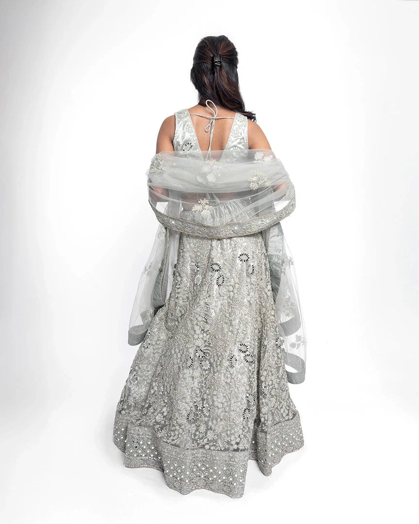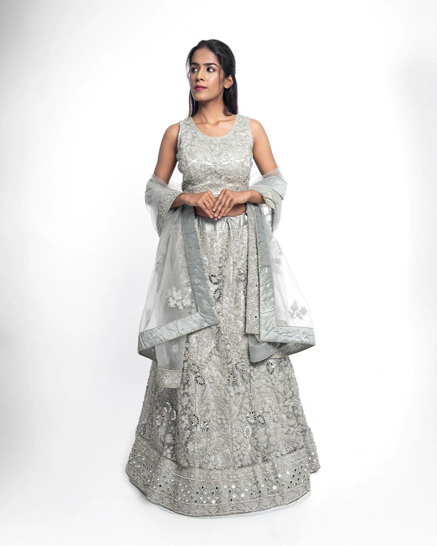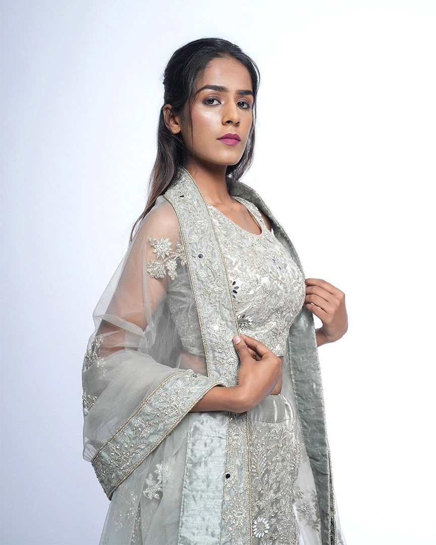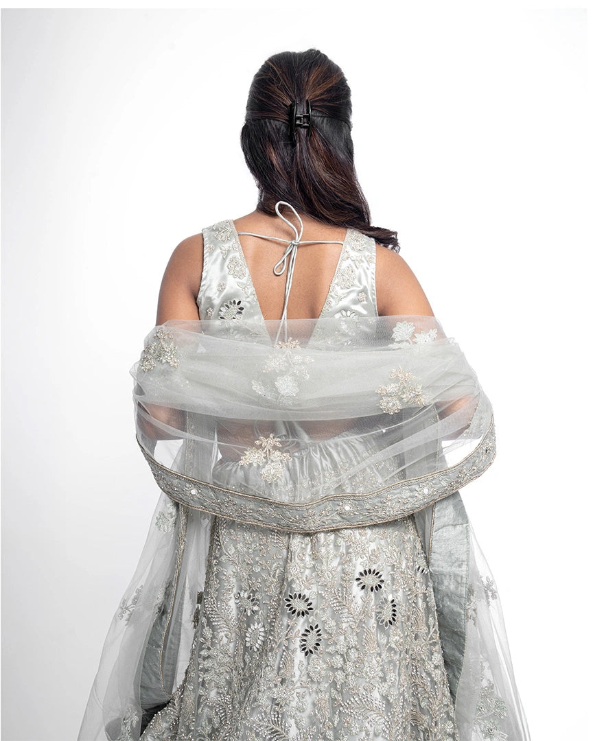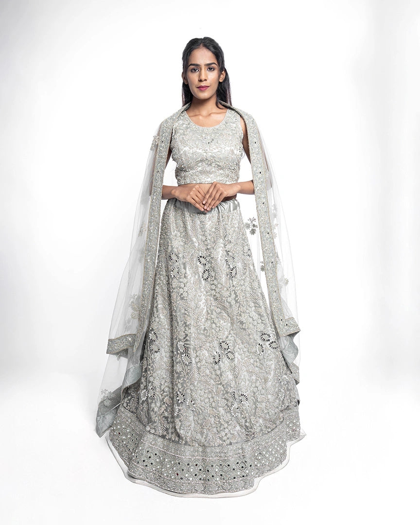 A pastel green dream — this lehenga is drenched in lavish embroidery and dazzling stone work, making it the perfect pick for magical moments and elegant celebrations.