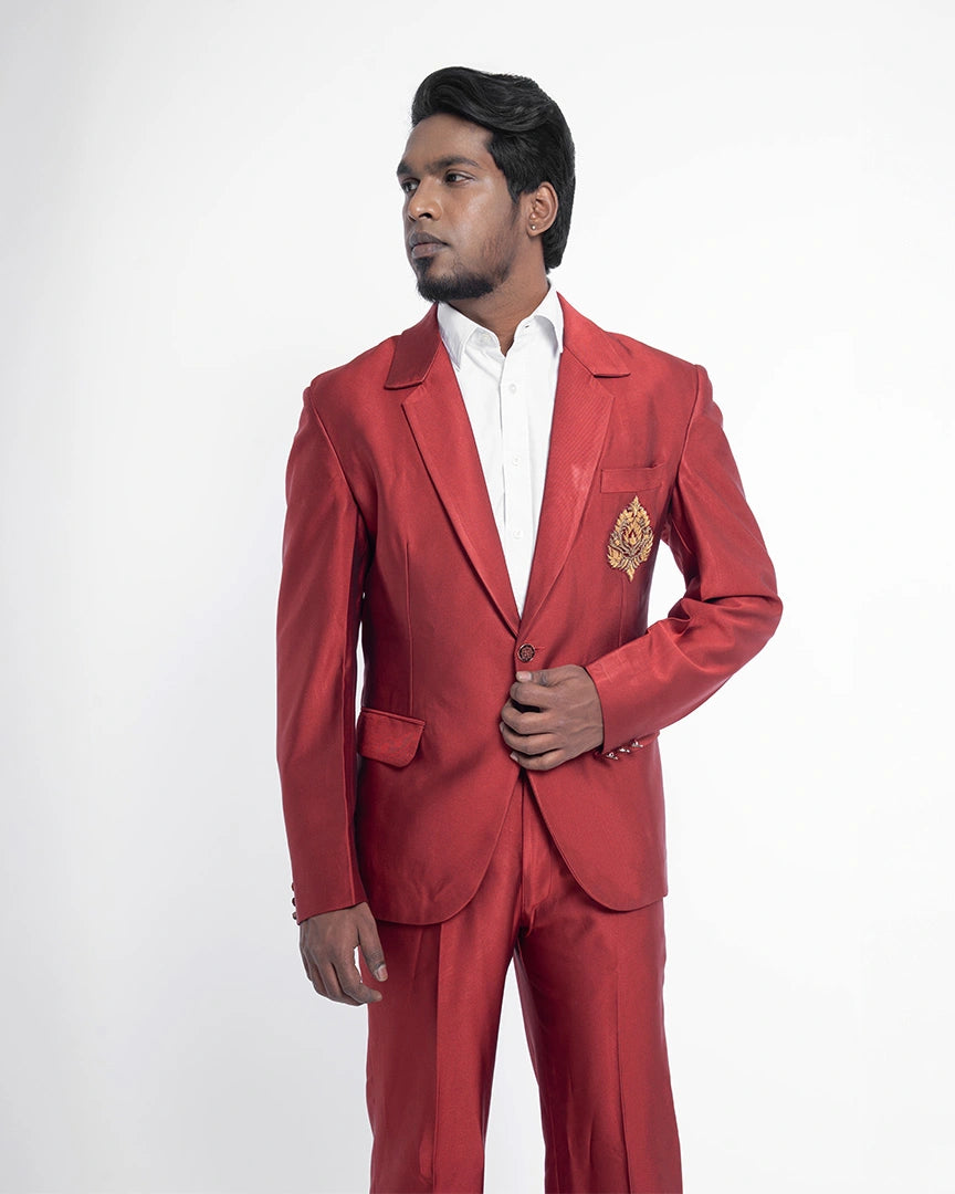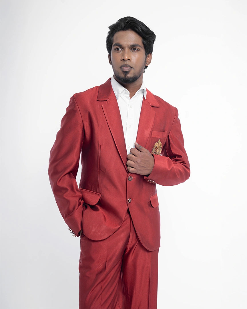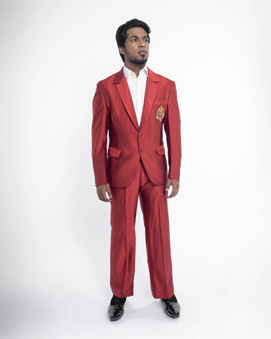 Regal charm comes alive in this striking red blazer suit, featuring an intricate chest design that sets it apart with royal elegance.